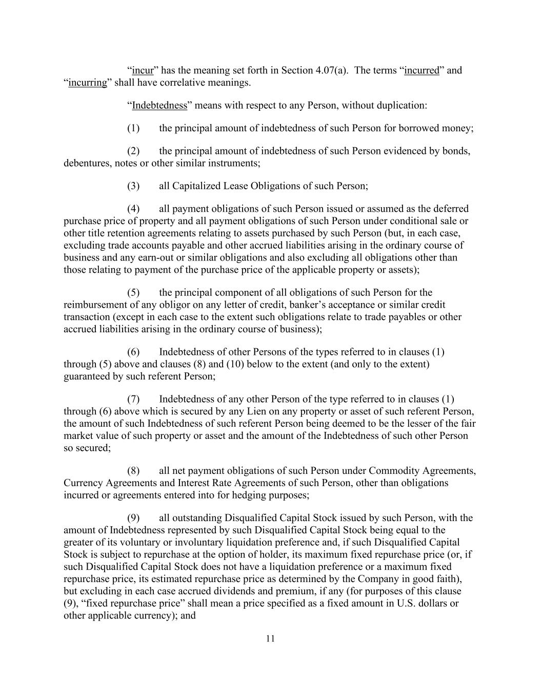 11“招致”具有第4.07(a)节规定的含义。“发生”与“发生”应具有相关含义。“负债”是指就任何人而言,不重复:(1)该人就所借款项的债务本金;(2)该人以债券、债权证、票据或其他类似工具为证据的债务本金;(3)该人的所有资本化租赁义务;(4)该人作为财产的递延购买价格而发行或承担的所有付款义务,以及该人根据有条件出售或其他与该人购买的资产有关的所有权保留协议所承担的所有付款义务(但在每种情况下,不包括在正常业务过程中产生的贸易应付账款和其他应计负债以及任何盈利或类似债务,也不包括与支付适用财产或资产的购买价款有关的债务以外的所有债务);(5)该人就任何信用证偿还任何债务人的所有债务的主要组成部分,银行承兑或类似信贷交易(在每种情况下,该等债务与正常业务过程中产生的贸易应付款项或其他应计负债有关的情况除外);(6)上文第(1)至(5)条及下文第(8)及(10)条所提述类型的其他人的债务,但以该提述人所担保的范围(且仅限于该范围);(7)以上文第(1)至(6)条所提述类型的任何其他人的债务,其由该提述人的任何财产或资产的任何留置权作担保,被视为该等财产或资产的公平市场价值与如此担保的该等其他人的债务金额两者中较低者的该等债务的金额;(8)该人根据该人的商品协议、货币协议和利率协议承担的所有净付款义务,但为对冲目的而招致的义务或订立的协议除外;(9)该人发行的所有未偿还的不合格股本,该等不合格股本所代表的债务金额等于其自愿或非自愿清算优先权中的较大者,且如该等不合格股本由持有人选择回购,则其最高固定回购价格(或,如果该等不合格股本没有清算优先权或最高固定回购价格,则其估计回购价格由公司善意确定),但不包括在每种情况下的应计股息和溢价(如有)(就本条第(9)款而言,“固定回购价格”是指以美元或其他适用货币指定为固定金额的价格);以及