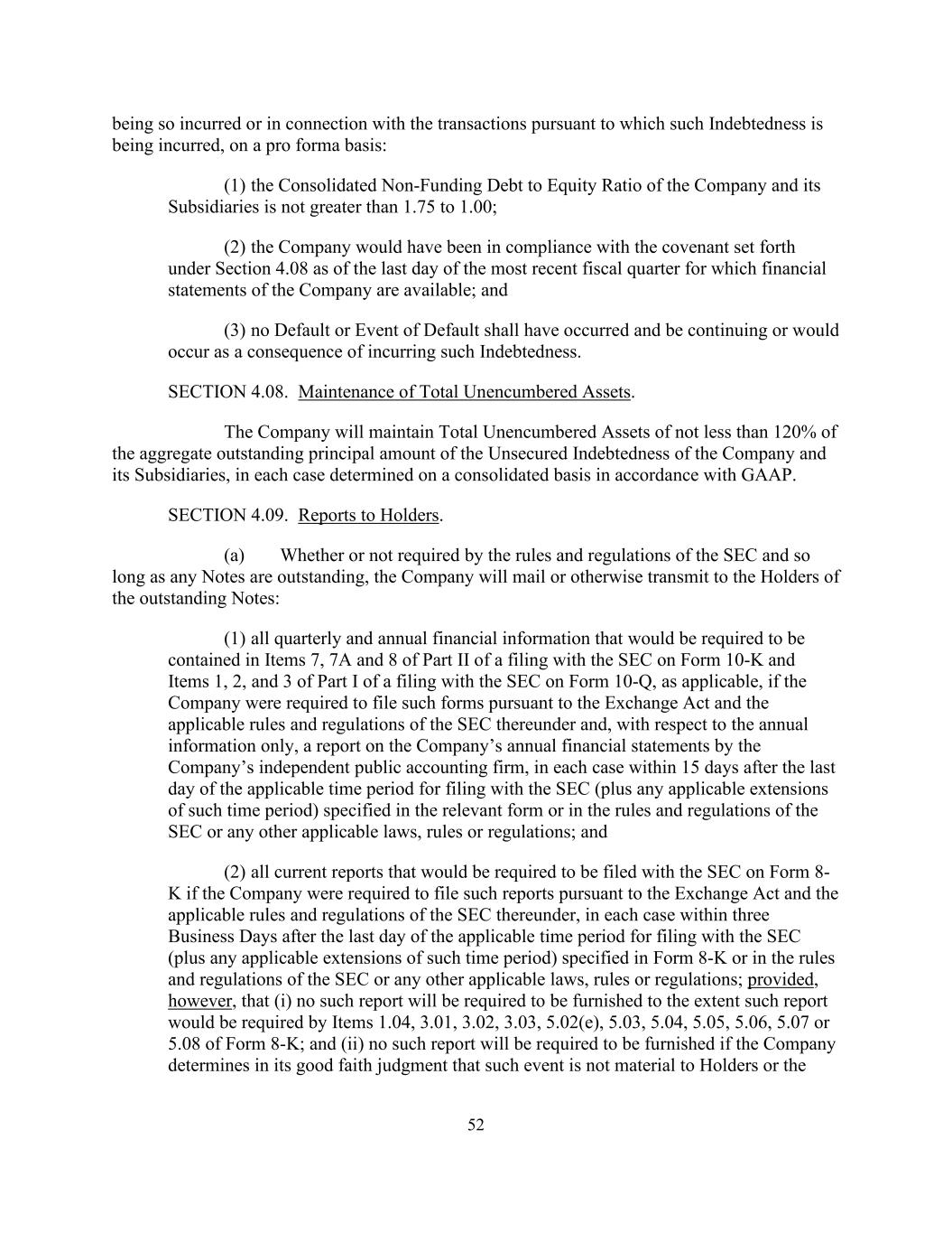 52如此招致或与此种负债所依据的交易有关,在备考基础上:(1)公司及其附属公司的综合非供资债务与权益比率不大于1.75至1.00;(2)截至可获得公司财务报表的最近一个财政季度的最后一天,公司本应遵守第4.08条规定的契约;(3)不应发生违约或违约事件,并且正在继续或将因产生此类债务而发生。第4.08节。维持未设押资产总额。公司将保持未设押资产总额不低于公司及其子公司未担保债务未偿本金总额的120%,在每种情况下均根据公认会计原则在综合基础上确定。第4.09节。向持有人报告。(a)无论SEC的规则和条例是否要求,只要有任何未偿还的票据,公司将向未偿还票据的持有人邮寄或以其他方式传送:(1)根据表格10-K向SEC提交的文件第II部分第7、7A和8项以及根据表格10-Q向SEC提交的文件第I部分第1项、2和3项(如适用)要求包含的所有季度和年度财务信息,如果公司被要求根据《交易法》及其下SEC的适用规则和条例提交此类表格,并且仅就年度信息而言,公司的独立公共会计师事务所就公司的年度财务报表提交报告,在每种情况下,在相关表格或SEC的规则和条例或任何其他适用法律中规定的向SEC提交文件的适用时间段(加上该时间段的任何适用延期)的最后一天后的15天内,规则或条例;(2)如果公司被要求根据《交易法》及其下SEC的适用规则和条例提交此类报告,则需要以8-K表格向SEC提交的所有当前报告,在每种情况下,在8-K表格或SEC的规则和条例或任何其他适用法律、规则或条例中规定的向SEC提交的适用时间段(加上此类时间段的任何适用延期)的最后一天后的三个工作日内;但是,前提是,(i)在表格8-K的项目1.04、3.01、3.02、3.03、5.02(e)、5.03、5.04、5.05、5.06、5.07或5.08所要求的范围内,将不会要求提供该报告;及(ii)如公司在其善意判断中确定该事件对持有人并不重要或