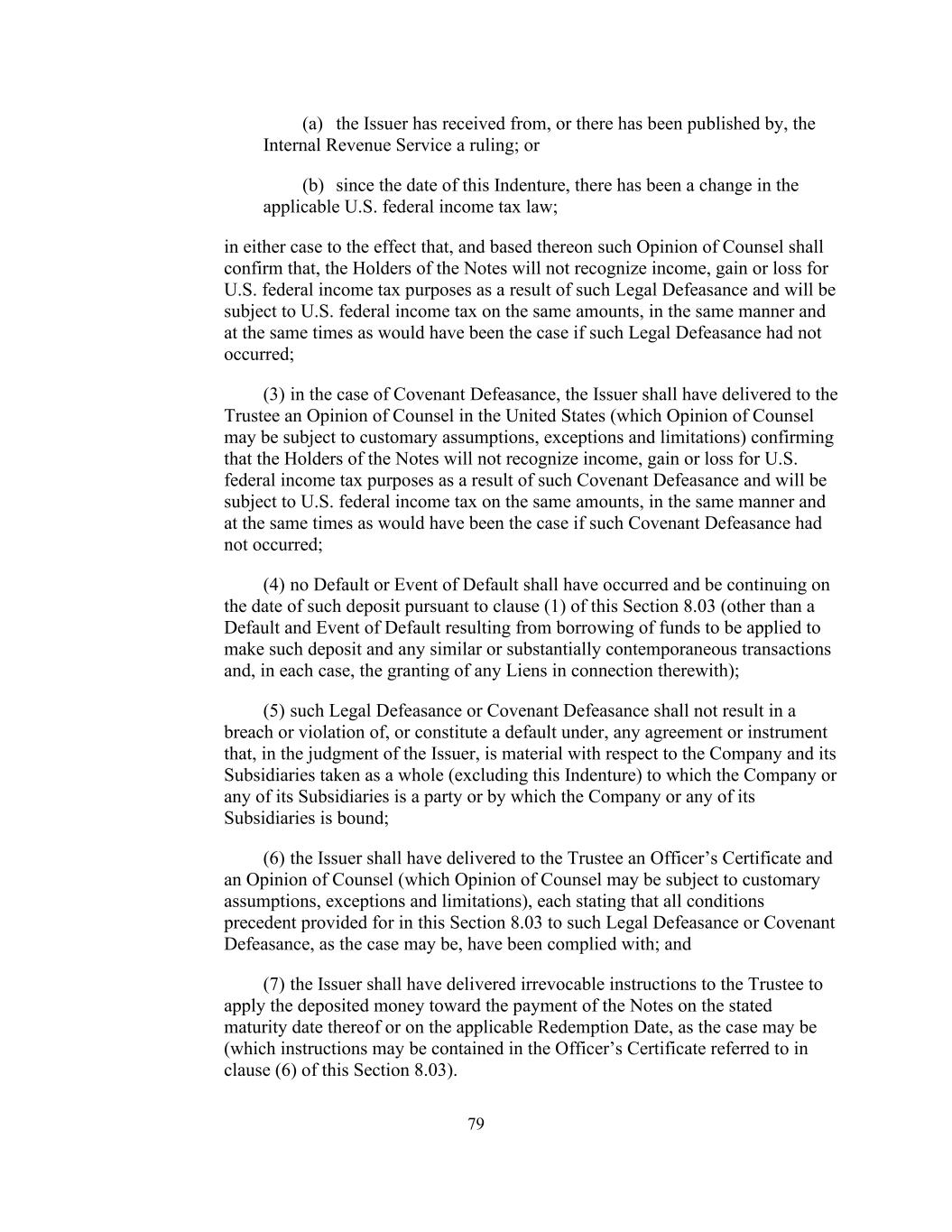 79(a)发行人已收到美国国税局的裁决,或已有美国国税局公布的裁决;或(b)自本契约之日起,适用的美国联邦所得税法发生了变化;在任何一种情况下,大意是,并基于此,律师的意见应确认,票据持有人将不会因此类法律失效而为美国联邦所得税目的确认收入、收益或损失,并将按相同金额缴纳美国联邦所得税,(3)在《公约》失效的情况下,发行人应已向受托人交付美国律师的意见(律师的意见可能受惯常假设、例外和限制的约束),确认票据持有人不会因该《公约》失效而为美国联邦所得税目的确认收入、收益或损失,并将按相同金额缴纳美国联邦所得税,(4)根据本条第8.03条第(1)款,在该存款的日期,任何违约或违约事件均不得发生,且仍在继续(但因借入将用于作出该存款的资金及任何类似或实质上同期的交易而导致的违约和违约事件除外,在每种情况下,与此有关的任何留置权的授予);(5)该等法律失效或契约失效不应导致违反或违反任何协议或文书,或构成根据发行人的判断,(6)发行人须已向受托人交付高级人员证书及大律师意见(大律师意见可能受惯常假设、例外情况及限制),每项意见均须述明本条第8.03条就该等法律失责或契约失责(视属何情况而定)所订定的所有先决条件,已获遵从;及(7)发行人须已向受托人交付不可撤销的指示,以在票据的指明到期日或适用的赎回日期(视属何情况而定)将存款用于支付票据(该指示可载于本条第8.03条第(6)款所提述的高级人员证明书)。