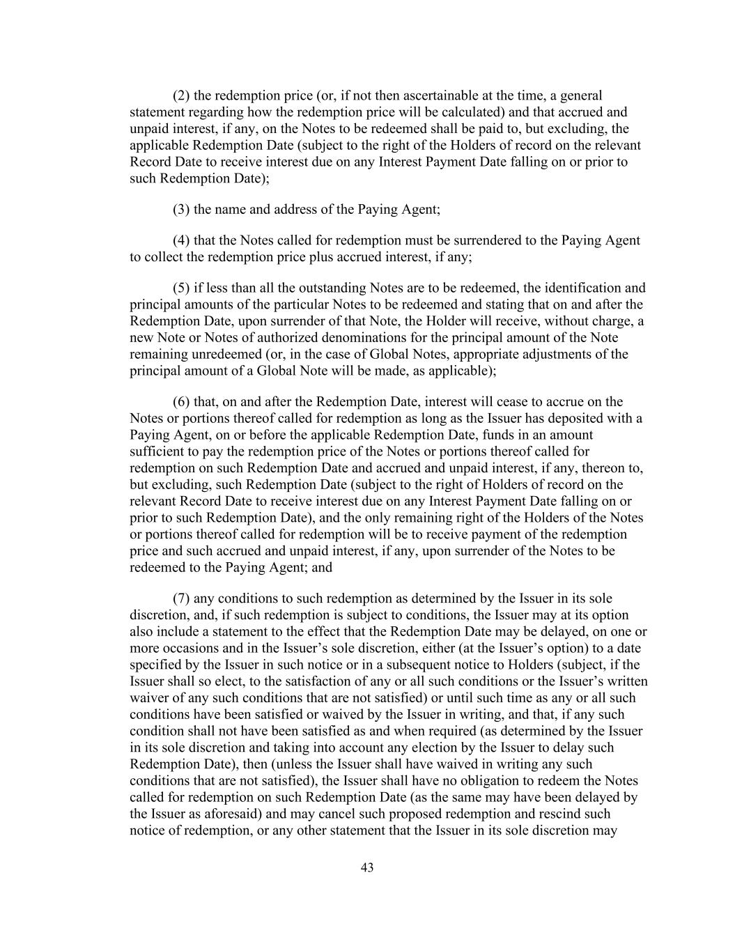 43(2)赎回价格(或,如果当时无法确定,有关如何计算赎回价格的一般说明),以及将被赎回票据的应计未付利息(如有)应支付给,但不包括,适用的赎回日期(受限于有关记录日期的记录持有人有权收取在该赎回日期或之前的任何利息支付日期到期的利息);(3)付款代理的名称和地址;(4)要求赎回的票据必须交还给付款代理以收取赎回价格加上应计利息(如有);(5)如果少于所有待赎回的未偿还票据,将予赎回的特定票据的识别及本金金额,并述明在赎回日期及之后,在交出该票据时,持有人将免费收到一张新票据或一张未获赎回票据本金金额的授权面额票据(或就全球票据而言,将对全球票据本金金额作出适当调整,视情况而定);(6)在赎回日期及之后,只要发行人在适用的赎回日期或之前向付款代理人存入足以支付在该赎回日期被要求赎回的票据或其部分的赎回价格以及截至但不包括该赎回日期的应计及未付利息(如有的话)的资金,则利息将停止在被要求赎回的票据或其部分上累积,(但须受限于相关记录日期的记录持有人有权收取在该赎回日期或之前的任何利息支付日期到期的利息),而被要求赎回的票据或其部分的持有人的唯一剩余权利将是在向付款代理交出将予赎回的票据时收取赎回价款及该等应计未付利息(如有);及(7)发行人全权酌情决定的有关该等赎回的任何条件,如该等赎回受条件规限,发行人可选择亦包括一份声明,大意为赎回日期可能会延迟,在一次或多次且由发行人全权酌情决定的情况下,(由发行人选择)至发行人在该通知中或在随后发给持有人的通知中指定的日期(前提是,如果发行人应如此选择,则须满足任何或所有该等条件或发行人书面放弃任何未满足的该等条件),或直至任何或所有该等条件已获发行人书面满足或放弃,并且,如任何该等条件在规定时(由发行人全权酌情决定并考虑到发行人选择延迟该赎回日期)未获满足,则(除非发行人已书面放弃任何未获满足的该等条件),发行人没有义务在该赎回日期赎回被要求赎回的票据(因为发行人可能已如前述延迟),并可取消该建议赎回并撤销该赎回通知,或发行人可全权酌情决定的任何其他声明