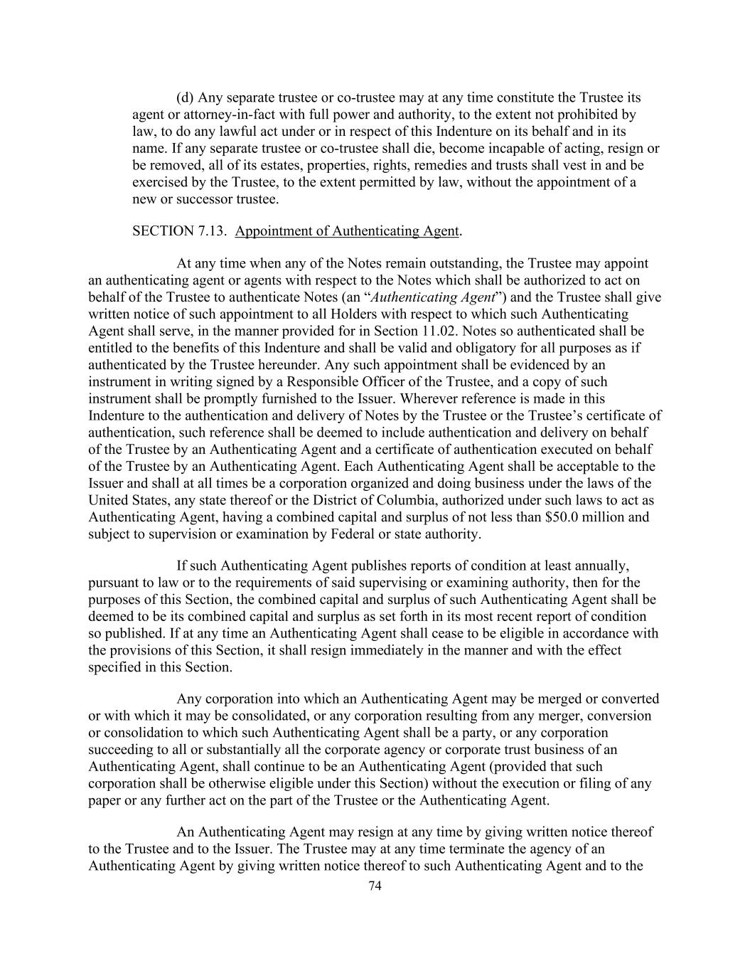 74(d)任何单独的受托人或共同受托人可在任何时候构成受托人的代理人或事实上的代理人,在法律不加禁止的范围内,具有全权和授权,代表其并以其名义根据本契约或就本契约作出任何合法作为。如任何单独的受托人或共同受托人去世、丧失行为能力、辞职或被免职,则其所有财产、财产、权利、补救措施和信托应在法律允许的范围内归属于受托人并由其行使,而无需任命新的或继任的受托人。第7.13节。委任认证代理。在任何票据仍未清偿的任何时间,受托人可就票据委任一名或多于一名获授权代受托人认证票据的认证代理人(“认证代理人”),而受托人须按第11.02条规定的方式,向该认证代理人须就其服务的所有持有人发出该委任的书面通知。经如此认证的票据应有权享有本义齿的利益,并且在所有目的上均应是有效和强制性的,如同根据本协议由受托人认证一样。任何该等委任须以受托人负责人员签署的书面文书作为证明,并须迅速向发行人提供该文书的副本。凡本契约中提及受托人认证和交付票据或受托人的认证证书,则该提及应被视为包括由认证代理人代表受托人认证和交付以及由认证代理人代表受托人签立的认证证书。每个认证代理应为发行人所接受,并且在任何时候都应是根据美国、其任何州或哥伦比亚特区的法律组织和开展业务的公司,根据这些法律被授权担任认证代理,其资本和盈余总额不低于5000万美元,并接受联邦或州当局的监督或审查。如果该认证代理人至少每年根据法律或根据上述监督或审查机关的要求公布条件报告,则就本节而言,该认证代理人的合并资本和盈余应被视为其如此公布的最近一次条件报告中所述的合并资本和盈余。认证代理人在任何时候根据本条规定不再符合资格的,应当立即按照本条规定的方式和效力辞职。认证代理人可被合并或转换为或可与其合并的任何法团,或由该认证代理人作为一方的任何合并、转换或合并产生的任何法团,或继承认证代理人的全部或实质上全部公司代理或公司信托业务的任何法团,均须继续为认证代理人(但该法团须根据本条另有资格),而无须受托人或认证代理人签署或提交任何文件或作出任何进一步的作为。认证代理人可以随时通过向受托人和发行人发出书面通知的方式离职。受托人可以随时通过向认证代理人发出书面通知的方式终止该认证代理人的代理工作,并向
