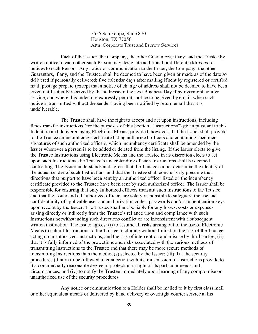 895555 San Felipe,Suite 870 Houston,TX77056 ATTn:Corporate Trust and Escrow Services发行人、公司、其他担保人(如有的话)和受托人各自通过向对方发出书面通知的方式可指定额外或不同的地址,以向该人发出通知。向发行人、公司、其他担保人(如有的话)和受托人发出的任何通知或通信,如亲自送达,则视为自如此送达之日起已发出或作出;如以挂号信或挂号信方式寄出,则视为自邮寄后五个日历日内已预付邮资(但地址变更通知在收件人实际收到前不得视为已发出);如以隔夜快递服务方式送达,则为下一个营业日;且本义齿明确允许以电子邮件方式发出通知的,当此类通知在未通过回邮邮件通知发件人无法送达的情况下被传送时。受托人有权接受指示并根据指示采取行动,包括依据本契约发出并使用电子手段交付的资金转移指示(就本节而言,为“指示”);但条件是发行人应向受托人提供一份在职证书,列出获授权人员名单,并载有该等获授权人员的样本签名,每当有人要从名单中添加或删除时,发行人应对该在职证书进行修改。如果发行人选择使用电子手段向受托人发出指示,而受托人酌情选择根据该指示行事,则受托人对该指示的理解应被视为控制。发行人理解并同意,受托人无法确定此类指示的实际发送者的身份,并且受托人应最终推定,看来是由提供给受托人的在职证书上所列的授权人员发出的指示已由该授权人员发出。发行人应负责确保只有授权官员向受托人传送此类指示,并且发行人和所有授权官员在发行人收到适用的用户和授权代码、密码和/或认证密钥后全权负责保护其使用和保密。受托人不对因受托人依赖和遵守该等指示而直接或间接产生的任何损失、费用或开支承担责任,尽管该等指示与随后的书面指示相冲突或不一致。发行人同意:(i)承担因使用电子手段向受托人提交指令而产生的所有风险,包括但不限于受托人根据未经授权的指令行事的风险,以及被第三方拦截和滥用的风险;(ii)充分了解向受托人传送指令的各种方法相关的保护措施和风险,以及可能存在比发行人选择的方法更安全的传送指令的方法;(iii)(四)在获悉任何妥协或未经授权使用担保程序后,立即通知受托人,与其传递指示有关的担保程序(如有)根据其特殊需要和情况向其提供商业上合理程度的保护。对持有人的任何通知或通信,应以头等邮件或其他同等方式邮寄或以专人递送或隔夜快递服务方式送达其本人