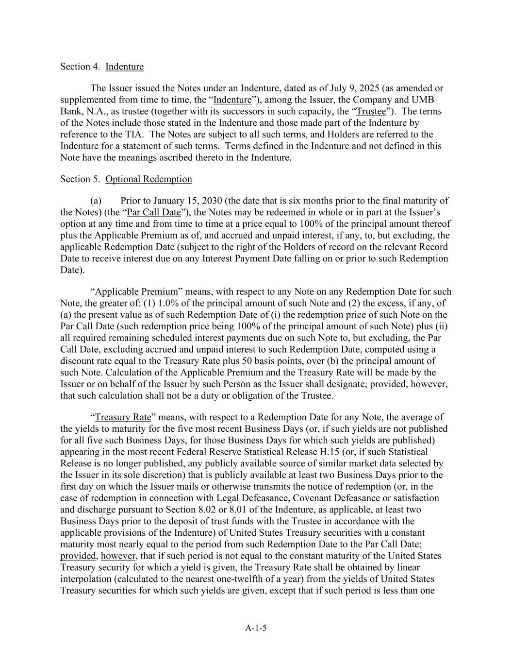 A-1-5 4段。义齿发行人根据日期为2025年7月9日的义齿(经不时修订或补充,“义齿”)发行票据,发行人、公司及作为受托人(连同其以此身份的继任者,“受托人”)的UMB银行。票据的条款包括在义齿中所述的条款以及通过参考TIA而成为义齿一部分的条款。票据受所有此类条款的约束,持有人被转介至契约以获得此类条款的声明。义齿中定义和未在本说明中定义的术语具有义齿中赋予的含义。第5节。可选择赎回(a)于2030年1月15日(即票据最后到期日前六个月的日期)(「票面赎回日」)之前,发行人可选择在任何时间及不时以相当于其本金金额的100%加上截至当日的适用溢价及应计及未付利息(如有的话)的价格全部或部分赎回票据,但不包括,适用的赎回日期(受限于相关记录日期的记录持有人有权收取在该赎回日期或之前的任何利息支付日到期的利息)。“适用溢价”指,就该票据于任何赎回日期的任何票据而言,以下两者中较高者为准:(1)该票据本金额的1.0%及(2)(a)(i)该票据于票面赎回日的赎回价格(该赎回价格为该票据本金额的100%)的截至该赎回日期的现值的超出部分(如有)加上(ii)该票据于票面赎回日到期的所有规定的剩余预定利息付款,但不包括截至该赎回日期的应计未付利息,使用等于国库券利率加上50个基点的贴现率计算,超过(b)该票据的本金金额。适用的溢价和库藏利率将由发行人或由发行人指定的人代表发行人进行计算;但此种计算不应成为受托人的义务或义务。“国债利率”是指,就任何票据的赎回日期而言,最近五个工作日(或者,如果所有五个此类工作日均未公布此类收益率,则为那些公布此类收益率的工作日)的到期收益率的平均值出现在最近的美联储统计发布H.15(或者,如果此类统计发布不再公布,发行人全权酌情选择的任何公开的类似市场数据来源),在发行人邮寄或以其他方式传送赎回通知的第一天(或者,在与法律失效、契约失效或根据义齿第8.02或8.01条(如适用)的满足和解除有关的赎回的情况下,至少在两个工作日前公开,根据义齿的适用条款向受托人存入信托资金前至少两个营业日)的美国国债,其固定期限几乎等于从该赎回日到票面赎回日的期间;但前提是,如果该期限不等于给予收益率的美国国债的固定期限,国库券利率应从给出此类收益率的美国国库券的收益率中通过线性插值(计算到最接近的一年的十二分之一)获得,但如果该期限低于1