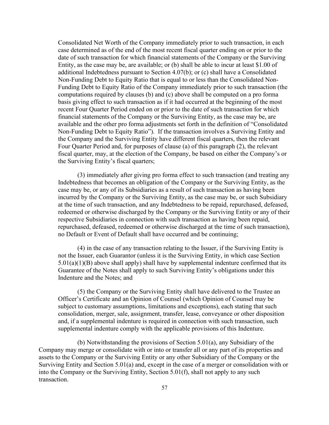57在紧接此类交易之前的公司合并净值,在每种情况下,在公司或存续实体(视情况而定)的财务报表所针对的此类交易之日或之前结束的最近一个财政季度末确定,可用;或(b)应能够根据第4.07(b)节产生至少1.00美元的额外债务;或(c)应具有等于或低于紧接此类交易之前公司的合并非融资债务与股权比率的合并非融资债务与股权比率(上述(b)和(c)条要求的计算应在使此类交易生效的备考基础上计算为如果发生在该交易日期或之前结束的最近一个四季期开始时,公司或存续实体(视情况而定)的财务报表可用,以及“合并无融资债务与权益比率”定义中规定的其他备考调整)。如果交易涉及存续实体,而公司和存续实体有不同的财政季度,则相关的四季度期间以及就本款第(2)款(a)项而言,相关财政季度,可根据公司的选择,以公司或存续实体的财政季度为基础;(3)在对该交易给予形式上的效力后立即(并处理成为公司或存续实体的义务的任何债务,视情况而定,或其任何附属公司因该等交易已由公司或存续实体(视属何情况而定)或该等附属公司于该等交易发生时,以及任何须由公司或存续实体或其任何各自附属公司就该等交易偿还、购回、失效、赎回或以其他方式解除的债务(如在该等交易发生时已获偿还、购回、失效、赎回或以其他方式解除),任何违约或违约事件均不得已发生且仍在继续;(4)在与发行人有关的任何交易的情况下,如果存续实体不是发行人,则各担保人(除非是存续实体,在这种情况下,上述第5.01(a)(1)(b)条应适用)应通过补充契约确认其对票据的担保应适用于该存续实体在本契约和票据下的义务;及(5)公司或存续实体应已向受托人交付高级职员证书和律师意见(律师的意见可能受惯常假设、限制和例外情况的约束),每一份均说明该等合并、合并、出售、转让、转让、租赁、转易或其他处置,如果与该交易有关需要补充契约,此类补充契约符合本契约的适用条款。(b)尽管有第5.01(a)条的规定,公司的任何附属公司可与公司或存续实体或公司的任何其他附属公司或存续实体合并或合并,或将其全部或任何部分财产和资产转让给公司或存续实体和第5.01(a)条,除与公司或存续实体合并或合并的情况外,第5.01(f)条不适用于任何此类交易。