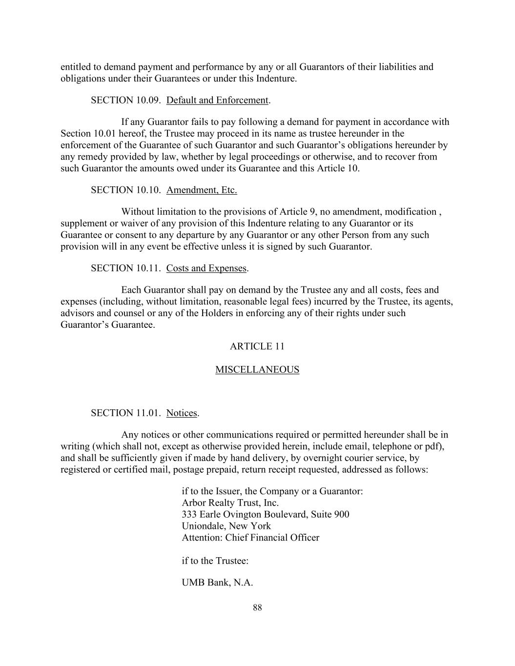 88有权要求任何或所有担保人支付和履行其在其担保项下或在本契约项下的责任和义务。第10.09节。违约和强制执行。如任何担保人在根据本协议第10.01条要求付款后未付款,则受托人可以其作为本协议项下受托人的名义通过法律规定的任何补救办法(无论是通过法律程序还是其他方式)强制执行该担保人的担保和该担保人在本协议项下的义务,并向该担保人追偿其担保项下所欠款项和本条第10款。第10.10节。修正案等。在不限于第9条规定的情况下,任何修订、修改、补充或放弃本义齿有关任何担保人的任何条款或其担保或同意任何担保人或任何其他人背离任何该等条款,在任何情况下均不会生效,除非该担保人签署。第10.11节。成本和开支。各担保人应按受托人的要求支付受托人、其代理人、顾问和大律师或任何持有人在执行其在该担保人担保项下的任何权利时发生的任何和所有成本、费用和开支(包括但不限于合理的法律费用)。第十一条杂项第11.01款。通知。本协议项下要求或允许的任何通知或其他通讯均应以书面形式(除本协议另有规定外,其中不应包括电子邮件、电话或pdf),并且如以专人递送、隔夜快递服务、挂号或挂号信、预付邮资、要求回执的方式发出,则应充分给予,地址如下:如果向发行人、公司或担保人:Arbor Realty Trust, Inc. 333 Earle Ovington Boulevard,Suite 900 Uniondale,New York注意:首席财务官如果向受托人:UMB Bank,N.A。