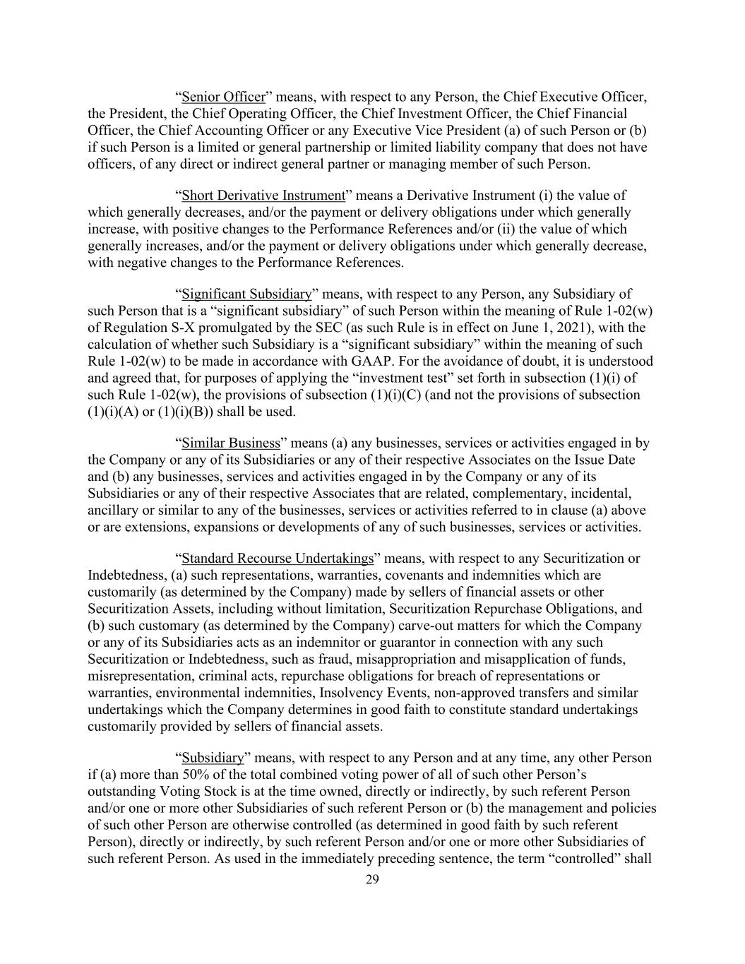 29“高级管理人员”是指,就任何人而言,首席执行官、总裁、首席运营官、首席投资官、首席财务官、首席财务官或该人的任何执行副总裁(a)或(b)如果该人是没有高级管理人员的有限或普通合伙或有限责任公司,则该人的任何直接或间接普通合伙人或管理成员。“空头衍生工具”是指(i)价值普遍下降的衍生工具,和/或根据其承担的付款或交付义务普遍增加,业绩参考发生积极变化和/或(ii)其价值普遍增加,和/或根据其承担的付款或交付义务普遍减少,业绩参考发生消极变化的衍生工具。“重要子公司”是指,就任何人而言,该人的任何子公司属于SEC颁布的S-X条例第1-02(w)条含义内该人的“重要子公司”(因为该规则于2021年6月1日生效),计算该子公司是否属于根据公认会计原则订立的该规则第1-02(w)条含义内的“重要子公司”。为免生疑问,据了解及同意,为适用该规则第1-02(w)条第(1)(i)款所载的“投资测试”,须使用第(1)款(i)(c)款的条文(而非第(1)款(i)(a)或(1)(i)(b)款的条文)。“同类业务”指(a)公司或其任何附属公司或其各自的任何联营公司于发行日期从事的任何业务、服务或活动,及(b)公司或其任何附属公司或其各自的任何联营公司从事的与上述(a)条所指的任何业务、服务或活动相关、互补、附带、附属或类似的任何业务、服务或活动,或为任何该等业务、服务或活动的延伸、扩展或发展。“标准追索承诺”是指,就任何证券化或债务而言,(a)金融资产或其他证券化资产的出卖人惯常(由公司确定)作出的此类陈述、保证、契诺和赔偿,包括但不限于证券化回购义务,以及(b)公司或其任何子公司就任何此类证券化或债务担任赔偿人或担保人的此类惯常(由公司确定)剥离事项,例如欺诈、挪用和误用资金、虚假陈述、犯罪行为、违反陈述或保证的回购义务、环境赔偿,公司善意认定构成金融资产出卖人惯常提供的标准承诺的破产事件、未经批准的转让及类似承诺。“子公司”是指,就任何人而言,在任何时候,任何其他人,如果(a)该等其他人的所有已发行有表决权股票的总合并投票权的50%以上在当时由该被提交人和/或该被提交人的一个或多个其他子公司直接或间接拥有,或(b)该其他人的管理层和政策以其他方式由该被提交人和/或该被提交人的一个或多个其他子公司直接或间接控制(由该被提交人善意确定)。前一句所用,“受控”一词由