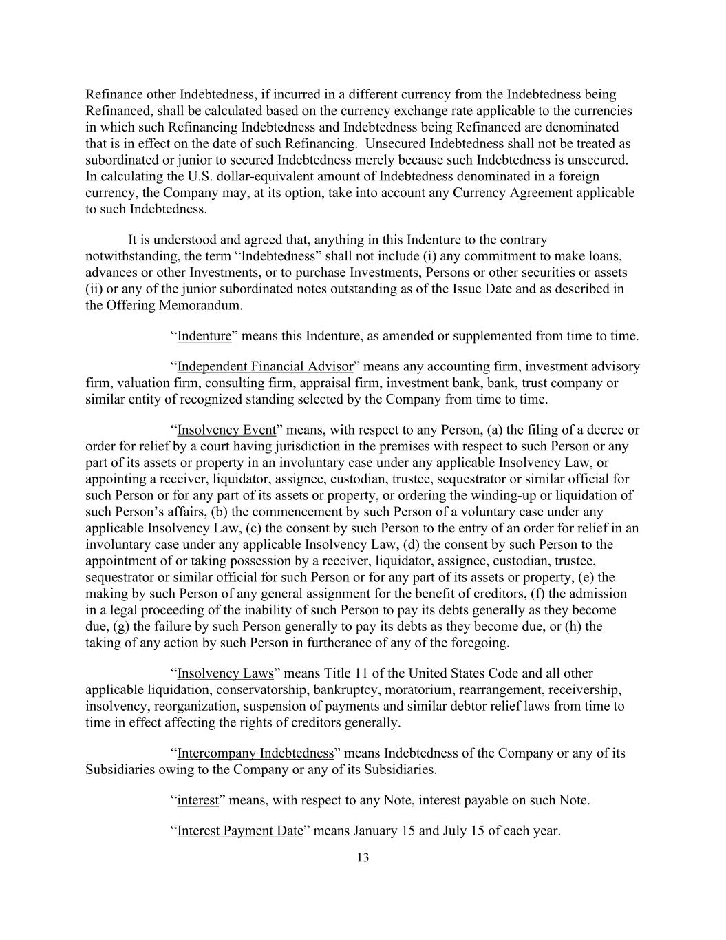 13再融资其他债务,如以与被再融资债务不同的币种发生,应按该再融资债务和被再融资债务计价货币适用的、在该再融资之日有效的货币汇率计算。无担保债务不应仅仅因为有担保债务是无担保的而被视为次级或次级于有担保债务。在计算以外币计价的等值美元债务金额时,公司可自行选择考虑适用于该债务的任何货币协议。据了解及同意,尽管本契约中有任何相反的情况,“债务”一词不应包括(i)作出贷款、垫款或其他投资的任何承诺,或购买投资、人员或其他证券或资产(ii)或截至发行日期和发售备忘录所述的任何未偿还的次级次级票据。“义齿”是指本义齿,经不时修订或补充。「独立财务顾问」指公司不时选聘的任何会计师事务所、投资顾问公司、估值公司、顾问公司、评估公司、投资银行、银行、信托公司或具有认可地位的类似实体。“破产事件”是指,就任何人而言,(a)根据任何适用的破产法就非自愿案件中的该人或其资产或财产的任何部分,由在处所内具有管辖权的法院就该人或其资产或财产的任何部分,或为该人或其资产或财产的任何部分指定接管人、清算人、受让人、托管人、受托人、扣押人或类似官员,或命令对该人的事务进行清盘或清算,(b)该人根据任何适用的破产法启动自愿案件,(c)该等人同意根据任何适用的破产法在非自愿情况下输入济助令,(d)该等人同意接管人、清盘人、受让人、保管人、受托人、扣押人或类似官员为该等人或其资产或财产的任何部分而委任或取得管有权,(e)该等人为债权人的利益而作出任何一般转让,(f)在法律程序中承认该等人一般无法在到期时偿付其债务,(g)该人一般未能在其债务到期时偿付债务,或(h)该人为促进上述任何一项而采取任何行动。“破产法”是指美国法典第11章和所有其他适用的清算、监管、破产、暂停、重新安排、接管、破产、重组、暂停付款和不时生效的类似债务人救济法律,这些法律普遍影响债权人的权利。“公司间债务”是指公司或其任何附属公司对公司或其任何附属公司的债务。“利息”是指,就任何票据而言,就该票据应付的利息。“付息日”是指每年的1月15日和7月15日。