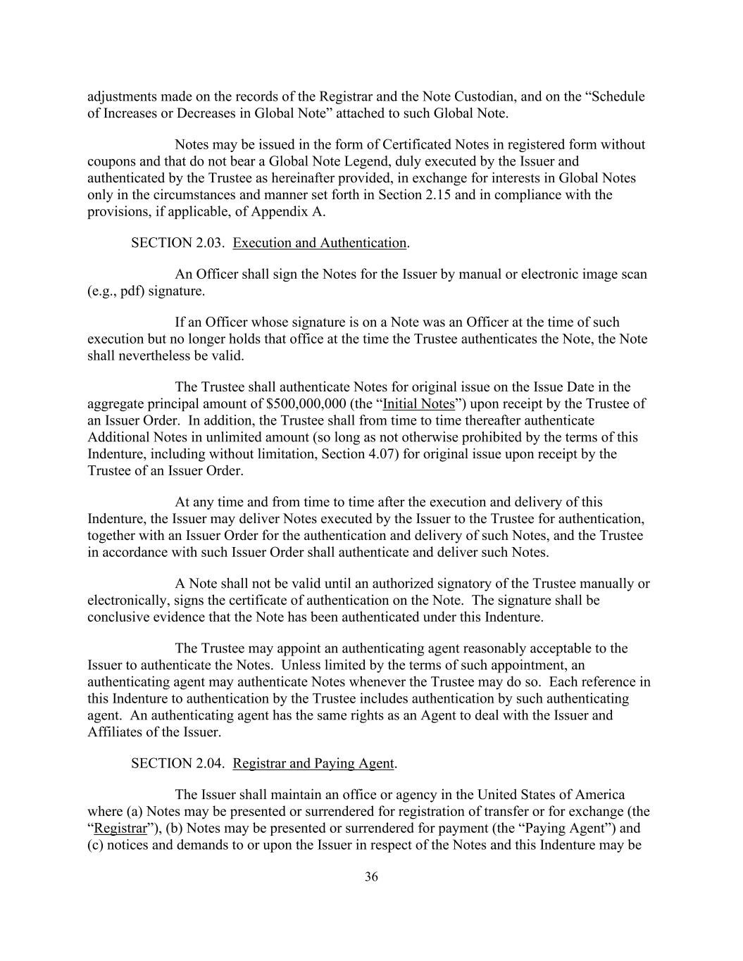 对书记官长和票据托管人的记录以及该全球票据所附的“全球票据增减明细表”进行36项调整。票据可以注册形式的无息票、且不带有全球票据图例的有凭证票据形式发行,由发行人正式签署并按下文规定由受托人认证,仅在第2.15节规定的情况和方式下并在符合附录A的规定(如适用)的情况下,以交换全球票据的权益。第2.03节。执行和认证。高级人员须以手工或电子图像扫描(例如pdf)签字方式为发行人签署《说明》。如任何人员的签名在一份说明上,在签立时是一名人员,但在受托人认证该说明时已不再担任该职务,则该说明仍然有效。受托人在收到发行人指令后,应在发行日对本金总额为500,000,000美元的原始发行票据(“初始票据”)进行认证。此外,受托人在收到发行人指令后,应不时为原始发行的无限量附加票据(只要不受本契约条款禁止,包括但不限于第4.07条)进行认证。在本契约签立及交付后的任何时间及不时,发行人可将由发行人签立的票据交付受托人认证,连同有关认证及交付该等票据的发行人命令,而受托人须按照该等发行人命令认证及交付该等票据。在受托人的授权签字人以手工或电子方式在票据上签署认证证书之前,票据不得有效。该签字应为票据已根据本义齿认证的确凿证据。受托机构可以指定发行人合理接受的认证代理人对票据进行认证。除非受该委任条款所限,认证代理人可随时认证Notes,但受托人可这样做。本Indenture中对受托人认证的每个引用都包括此类认证代理的认证。认证代理享有与代理机构同等的权利,与发行人及发行人的关联机构进行交易。第2.04节。注册官及付款代理人。发行人应在美利坚合众国设有办事处或代理机构,其中(a)可出示或交出票据以进行转让登记或交换(“注册官”),(b)可出示或交出票据以进行付款(“付款代理人”),以及(c)就票据向发行人或向发行人发出通知和要求,而本契约可