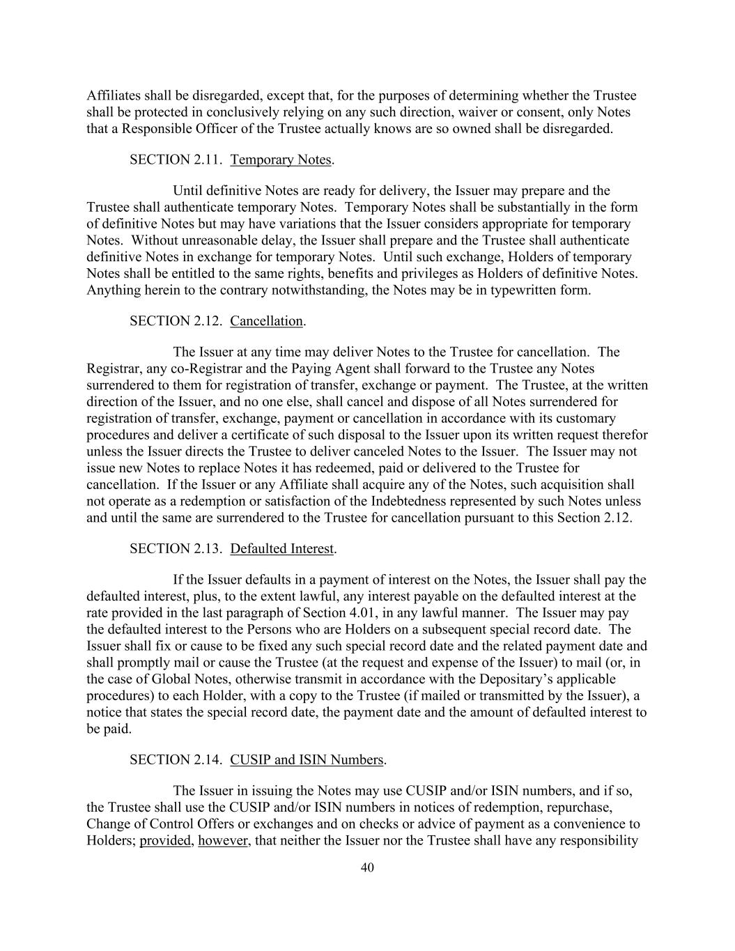 40附属公司应被忽略,但为确定受托人是否应在最终依赖任何此类指示、放弃或同意时受到保护,仅应忽略受托人的负责人员实际知道如此拥有的注释。第2.11节。临时票据。在最终票据准备交付之前,发行人可以准备和受托人对临时票据进行认证。临时票据应基本上采用最终票据的形式,但可能有发行人认为适合临时票据的变化。不得无理拖延,发行人应准备并由受托人认证最终票据,以换取临时票据。在这种交换之前,临时票据持有人应享有与最终票据持有人相同的权利、利益和特权。尽管本文中有任何与之相反的内容,本说明可能采用打字形式。第2.12节。取消。发行人可以随时将票据交付受托人注销。书记官长、任何共同书记官长及付款代理人须将任何交还予他们以作转让、交换或付款登记的票据转交受托人。受托人应发行人的书面指示而非其他任何人,应按照其惯常程序注销和处置为登记转让、交换、付款或注销而交出的所有票据,并应发行人的书面请求向发行人交付此种处置的凭证,除非发行人指示受托人向发行人交付已注销的票据。发行人不得发行新票据以取代其已赎回、支付或交付受托人注销的票据。如发行人或任何附属公司须收购任何票据,则该收购不得作为赎回或清偿该等票据所代表的债务,除非且直至该等债务根据本条2.12交回受托人注销。第2.13节。违约利息。如果发行人拖欠票据利息的支付,发行人应以任何合法方式支付违约利息,并在合法的范围内,按照第4.01条最后一段规定的利率支付违约利息的任何应付利息。发行人可以向后续特别登记日的持有人支付违约利息。发行人应确定或促使确定任何该等特别记录日期及相关的付款日期,并应迅速邮寄或促使受托人(应发行人的请求和费用)向每个持有人邮寄(或在全球票据的情况下,以其他方式按照存托人的适用程序传送),并向受托人提供一份副本(如由发行人邮寄或传送),说明特别记录日期、付款日期和将支付的违约利息金额的通知。第2.14节。CUSIP和ISIN号码。发行人在发行票据时可以使用CUSIP和/或ISIN号码,如果使用,受托人应在赎回、回购、控制权变更要约或交换通知中以及在支票或付款建议中使用CUSIP和/或ISIN号码,以方便持有人;但发行人和受托人均不承担任何责任