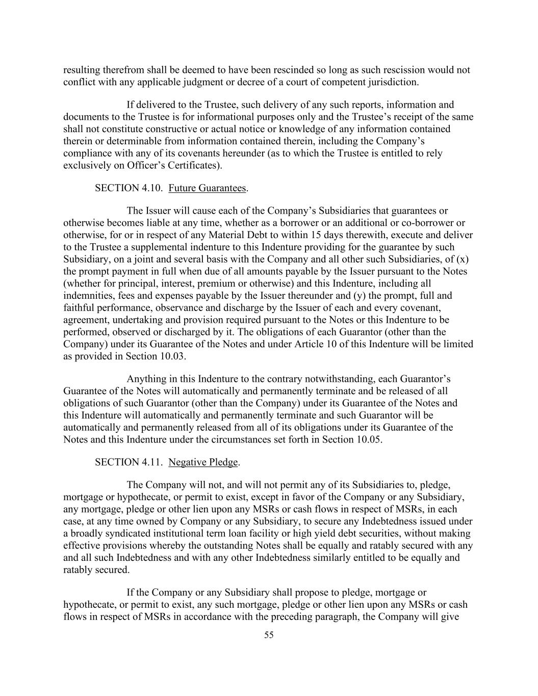 由此产生的55应被视为已被撤销,只要此种撤销不会与有管辖权的法院的任何适用判决或法令相冲突。如交付予受托人,向受托人交付任何该等报告、资料及文件仅供参考,而受托人收到该等报告、资料及文件,并不构成对其中所载或可从其中所载资料确定的任何资料的推定或实际通知或知悉,包括公司遵守其根据本协议订立的任何契诺(受托人有权完全依赖高级人员证书)。第4.10节。未来保障。发行人将促使公司的每一家担保或以其他方式承担责任的子公司,无论是作为借款人或额外或共同借款人或其他方式,就任何重大债务或就任何重大债务,在15天内签署并向受托人交付本契约的补充契约,规定该子公司与公司和所有其他此类子公司在共同和若干基础上提供担保,(x)发行人根据票据应付的所有款项到期时迅速全额支付(无论是本金,利息、溢价或其他)和本契约,包括发行人根据该契约应付的所有弥偿、费用和开支,以及(y)发行人及时、充分和忠实地履行、遵守和解除根据票据或本契约要求由其履行、遵守或解除的每一项契诺、协议、承诺和规定。各担保人(公司除外)根据其对票据的担保和本契约第10条承担的义务将受到第10.03节规定的限制。尽管本契约中有任何相反的情况,每个担保人对票据的担保将自动永久终止并解除该担保人(公司除外)在其对票据的担保下的所有义务,而本契约将自动永久终止,并且该担保人将在第10.05节规定的情况下自动永久解除其在其对票据和本契约的担保下的所有义务。第4.11节。负质押。公司将不会、也不会允许其任何子公司质押、抵押或质押,或允许存在任何MSR或与MSR有关的现金流量的任何抵押、质押或其他留置权,除非有利于公司或任何子公司,在每种情况下,在公司或任何子公司拥有的任何时间,为根据广泛的银团机构定期贷款融资或高收益债务证券发行的任何债务提供担保,未作出有效规定,据此未偿还的票据应以任何和所有此类债务以及类似地有权获得同等和按比例担保的任何其他债务平等和按比例担保。如公司或任何附属公司根据前款对任何MSR或与MSR有关的现金流量提出质押、抵押或质押,或准许其存在任何该等抵押、质押或其他留置权,公司将给予