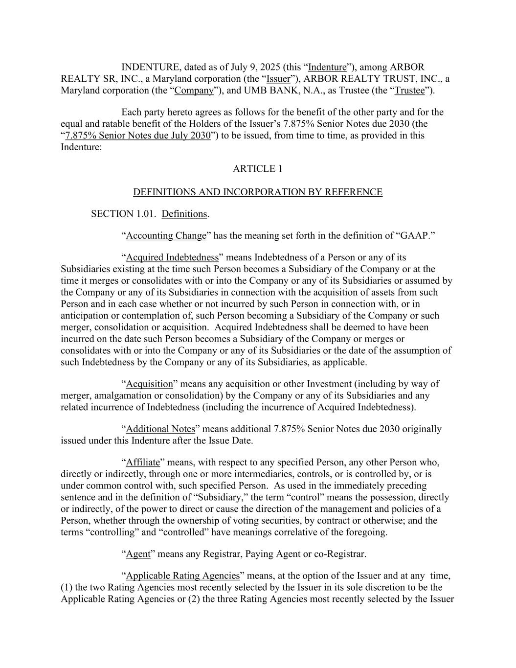 日期为2025年7月9日的契约(本“契约”),由马里兰州公司ARBOR REALTY SR,INC.(“发行人”)、马里兰州公司ARBOR REALTY TRUST,INC.(“公司”)和作为受托人(“受托人”)的UMB银行N.A.签署。为另一方的利益,以及为发行人2030年到期的7.875%优先票据(“2030年7月到期的7.875%优先票据”)持有人的平等和可予评定的利益,本协议各方同意如下,按本契约的规定不时发行:第1条定义和参照第1.01条纳入。定义。“会计变更”具有“GAAP”定义中阐述的含义。“获得的债务”是指在某人或其任何附属公司成为公司的附属公司时存在的债务,或在该人与公司或其任何附属公司合并或合并时存在的债务,或由公司或其任何附属公司承担的与向该人收购资产有关的债务,在每种情况下,无论该人是否因该人成为公司的附属公司或该合并、合并或收购而招致或预期或预期招致。获得的债务应被视为在该人成为公司的附属公司或与公司或其任何附属公司合并或合并或并入公司或其任何附属公司之日或公司或其任何附属公司(如适用)承担该等债务之日发生。“收购”指公司或其任何子公司的任何收购或其他投资(包括以合并、合并或合并的方式)以及任何相关的债务产生(包括已获得的债务产生)。“额外票据”指在发行日之后最初根据本契约发行的额外于2030年到期的7.875%优先票据。“关联”就任何特定人员而言,是指通过一个或多个中间人直接或间接控制或受该特定人员控制或与其共同控制的任何其他人员。正如前一句和“附属”定义中所使用的那样,“控制”一词是指直接或间接地拥有权力,以指导或导致某个人的管理和政策的方向,无论是通过对有表决权的证券的所有权、通过合同或其他方式;而“控制”和“受控”这两个词具有与上述相关的含义。“代理人”是指任何注册人、付款代理人或共同注册人。“适用评级机构”是指,根据发行人的选择并在任何时候,(1)发行人最近自行决定选定的两家评级机构为适用评级机构或(2)发行人最近选定的三家评级机构