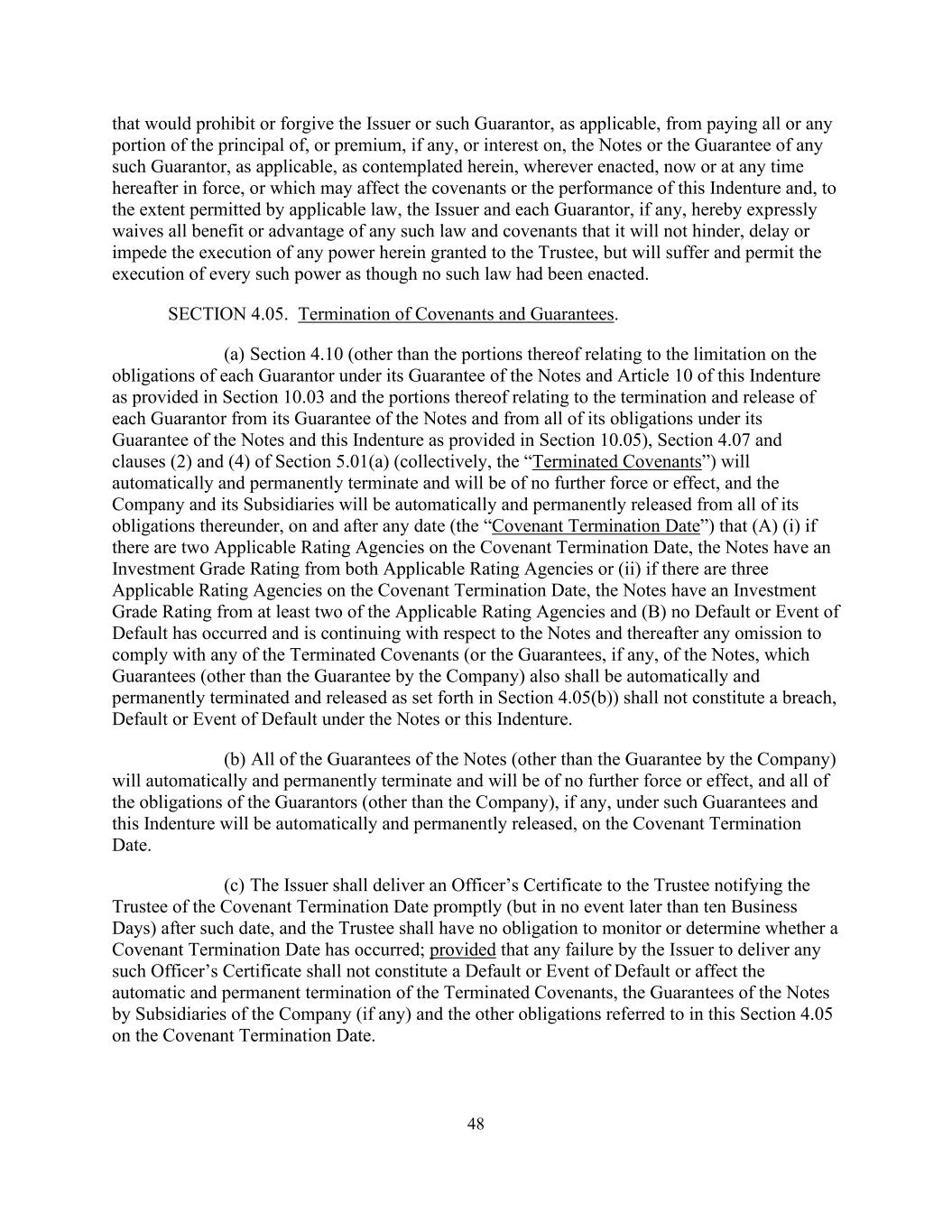 48将禁止或免除发行人或该担保人(如适用)支付票据的全部或任何部分本金或溢价(如有)或利息或任何该等担保人(如适用)的担保(如适用),在任何地方颁布、现在或以后的任何时间生效,或可能影响契诺或本契约的履行,并且在适用法律允许的范围内,发行人和每个担保人(如有)特此明确放弃其不会妨碍的任何该等法律和契诺的所有利益或好处,延迟或阻碍执行此处授予受托人的任何权力,但将遭受并允许执行每一项此类权力,就好像没有制定此类法律一样。第4.05节。终止契约及保证。(a)第4.10条(第10.03条规定的与每一担保人在其对票据的担保下的义务限制有关的部分和本义齿第10条规定的部分以及其中与每一担保人终止和解除其对票据的担保以及第10.05条规定的其在其对票据和本义齿的担保下的所有义务有关的部分除外)、第4.07条以及第5.01(a)条第(2)和(4)条(统称,“已终止的契约”)将自动永久终止,且不再具有任何效力或影响,而公司及其附属公司将于(a)(i)如在契约终止日期有两家适用的评级机构,票据具有来自两家适用的评级机构的投资级别评级,或(ii)如在契约终止日期有三家适用的评级机构,则在任何日期(“契约终止日期”)及之后自动永久解除其在其项下的所有义务,票据具有来自至少两家适用评级机构的投资级评级,并且(b)没有发生违约或违约事件,并且就票据而言仍在继续,此后任何未遵守任何已终止的契诺(或票据的担保,如有)的遗漏,其担保(公司的担保除外)也应按第4.05(b)节的规定自动永久终止和解除)不应构成票据或本契约项下的违约、违约或违约事件。(b)票据的所有担保(公司的担保除外)将自动永久终止,且不再具有任何效力或影响,而担保人(公司除外)在该等担保及本契约项下的所有义务(如有的话)将于契约终止日期自动永久解除。(c)发证人须在该日期后迅速(但在任何情况下不得迟于十个营业日)向受托人交付高级人员证明书,通知受托人契约终止日期,而受托人并无义务监察或决定是否已发生契约终止日期;但发证人未能交付任何该等高级人员证明书,并不构成违约或违约事件,或影响已终止的契约自动永久终止,本公司附属公司对票据的担保(如有的话)及本条第4.05条所提述的其他义务于契约终止日期。