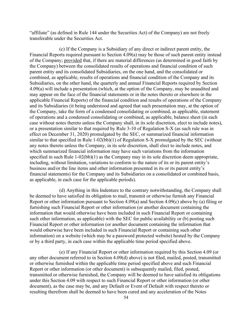 54家“关联公司”(定义见《证券法》第144条)根据《证券法》不得自由转让。(c)如果公司是任何直接或间接母公司的子公司,则根据第4.09(a)节要求的财务报告可能是该母公司的财务报告,而不是公司;但如果该母公司及其合并子公司的综合经营业绩和财务状况(一方面由公司善意确定)与公司及其子公司的综合或合并(如适用)经营业绩和财务状况之间存在重大差异,第4.09(a)节要求的季度和年度财务报告将包括(根据公司的选择,可能未经审计,并可能出现在财务报表的正面或其附注或适用的财务报告的其他部分)公司及其子公司的财务状况和经营业绩的列报(据理解并同意,根据公司的选择,这种列报可能采取简明合并或合并(如适用)经营报表和简明合并或合并(如适用)的形式,资产负债表(在每种情况下不附带任何票据,除非公司应自行决定选择包括票据),或与SEC颁布的S-X条例第3-10条(因为该规则于2020年12月31日生效)要求的类似的列报,或与SEC颁布的S-X条例第1-02(bb)(1)条规定的类似的汇总财务信息(不附带任何票据,除非公司应自行决定选择包括票据,以及哪些汇总财务信息可能与公司全权酌情认为适当的规则1-02(bb)(1)中规定的信息存在差异,包括但不限于为符合其或其母实体的业务性质和/或其或其母实体财务报表中列报的细列项目和其他信息而进行的差异(如适用)在适用期间的每种情况下)。(d)即使本指引中有任何相反的情况,公司须当作已履行其依据上文第4.09(a)及4.09(c)条邮寄、传送或以其他方式提供任何财务报告或其他资料的义务,方法是(a)提交或提供该等财务报告或其他资料(或另一份载有本应列入该等财务报告或载有该等其他资料的资料的文件,(如适用)向SEC公开,或(b)在公司或第三方托管的网站(可能是受密码保护的网站)上发布此类财务报告或其他信息(或包含本应包含在此类财务报告中的信息或包含此类其他信息的其他文件),在每种情况下均在上述规定的适用时间段内。(e)如本条第4.09条所规定的任何财务报告或其他资料(或上文第4.09(d)条所提述的任何其他文件)没有在上述指明的适用期间内提交、邮寄、张贴、传送或以其他方式提供,而该等财务报告或其他资料(或其他文件)其后又被邮寄、存档、张贴、传送或以其他方式提供,则公司将被视为已根据本条第4.09条就该等财务报告或其他资料(或其他文件)(视属何情况而定)履行其义务,及任何有关违约或违约事件或由此产生的违约或违约事件,均须当作已获纠正及票据的任何加速