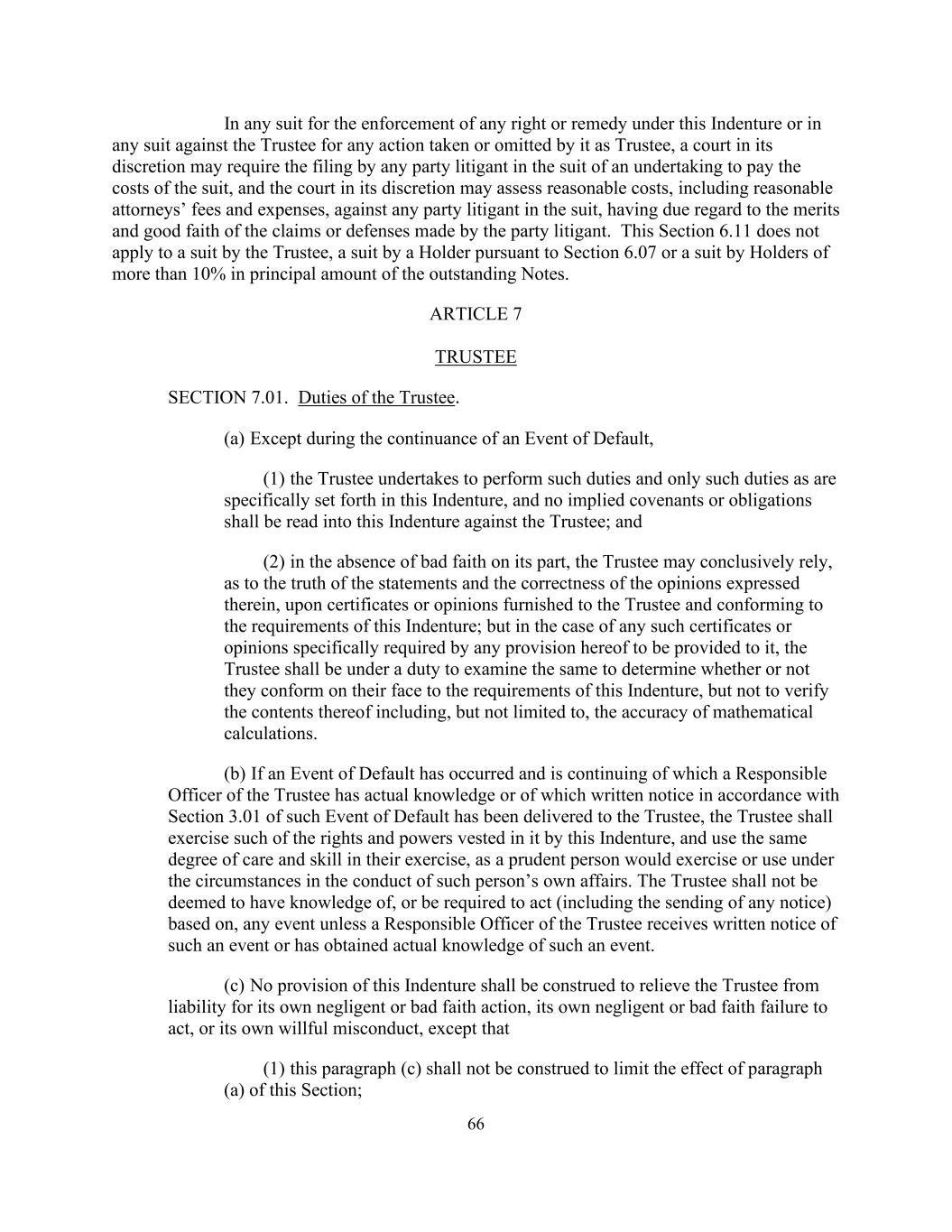66在任何强制执行本契约项下任何权利或补救措施的诉讼中,或就其作为受托人所采取或不采取的任何行动而针对受托人提起的任何诉讼中,法院可酌情要求诉讼中的任何一方诉讼当事人提出支付诉讼费用的承诺,而法院可酌情评估针对诉讼中任何一方诉讼当事人的合理费用,包括合理的律师费和开支,同时适当考虑一方诉讼当事人提出的索赔或抗辩的是非曲直和善意。本条第6.11条不适用于受托人提出的诉讼、持有人根据第6.07条提出的诉讼或持有人提出的未偿还票据本金超过10%的诉讼。第七条受托人第7.01款。受托人的职责。(a)除在违约事件持续期间外,(1)受托人承诺履行本契约中具体规定的职责,且仅履行本契约中具体规定的职责,且不得将任何默示的契诺或义务解读为对受托人不利;及(2)在其本身并无恶意的情况下,受托人可就陈述的真实性及其中所表达的意见的正确性作出最终依据,根据向受托人提供且符合本义齿要求的证明或意见;但如本协议任何条款具体要求向其提供任何此类证明或意见,受托人有责任对其进行审查,以确定其表面上是否符合本义齿的要求,但不核实其内容,包括但不限于数学计算的准确性。(b)如违约事件已发生并仍在继续,而受托人的负责人员实际知悉或已根据第3.01条就该违约事件向受托人送达书面通知,则受托人须行使本契约赋予其的权利及权力,并在行使这些权利及权力时使用与审慎的人在该情况下在处理该人自己的事务时所行使或使用的同等程度的谨慎及技巧。除非受托人的负责人员收到有关该事件的书面通知或已实际知悉该事件,否则受托人不得被视为知悉或被要求根据该事件采取行动(包括发送任何通知)。(c)本指引的任何条文不得解释为免除受托人对其本身的疏忽或恶意行动、本身的疏忽或恶意不作为或本身的故意不当行为的法律责任,但(1)本款(c)项不得解释为限制本条(a)款的效力;