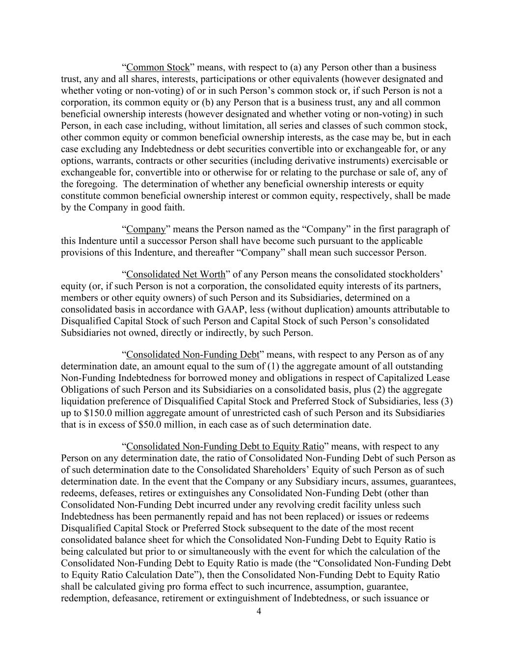 4“普通股”是指,就(a)商业信托以外的任何人而言,该人的普通股的任何和所有股份、权益、参与或其他等价物(无论是否被指定和有投票权或无投票权),或者,如果该人不是公司,其普通股权益或(b)任何属于商业信托的人,该人的任何和所有共同实益所有权权益(无论是否被指定和有投票权或无投票权),在每种情况下,包括但不限于该普通股的所有系列和类别、其他普通股权益或共同实益所有权权益,视情况而定,但在每宗个案中均不包括任何可转换为或可交换的债务或债务证券,或任何可行使或可交换的期权、认股权证、合约或其他证券(包括衍生工具),可转换为或以其他方式用于或与购买或出售上述任何一项有关。任何实益所有权权益或权益是否分别构成共同实益所有权权益或共同权益的确定,应由公司善意作出。“公司”是指在本契约第一段中被命名为“公司”的人,直到根据本契约的适用条款,一个继承人成为这样的人,此后“公司”是指该继承人。任何人的“合并净资产”是指根据公认会计原则在合并基础上确定的该人及其子公司的合并股东权益(或者,如果该人不是公司,则为其合伙人、成员或其他权益所有者的合并股权)减去(不重复)归属于该人不合格股本的金额以及该人未直接或间接拥有的该人合并子公司的股本。“合并无融资债务”是指,就任何人而言,截至任何确定日期,金额等于(1)该人及其子公司在合并基础上的借款和与资本化租赁义务有关的债务的所有未偿无融资债务的总额,加上(2)子公司的不合格股本和优先股的总清算优先权,减去(3)截至该确定日期,该人及其子公司的不受限制现金总额超过5000万美元的不超过1.5亿美元的总额(3)。“合并非融资性债务与权益比率”是指,就任何人士而言,在任何确定日期,该人士于该确定日期的合并非融资性债务与该人士于该确定日期的合并股东权益的比率。在公司或任何子公司发生、承担、担保、赎回、失效、在正在计算合并非融资性债务与权益比率的最近一期合并资产负债表日期之后但在计算合并非融资性债务与权益比率的事件(“合并非融资性债务与权益比率计算日期”)之前或同时进行的任何合并非融资性债务(在任何循环信贷额度下产生的合并非融资性债务除外,除非此类债务已被永久偿还且未被替换)或发行或赎回不合格的股本或优先股,然后计算合并的非资金债务与权益比率,给予此类债务的发生、承担、保证、赎回、撤销、报废或消灭的备考效力,或此类发行或