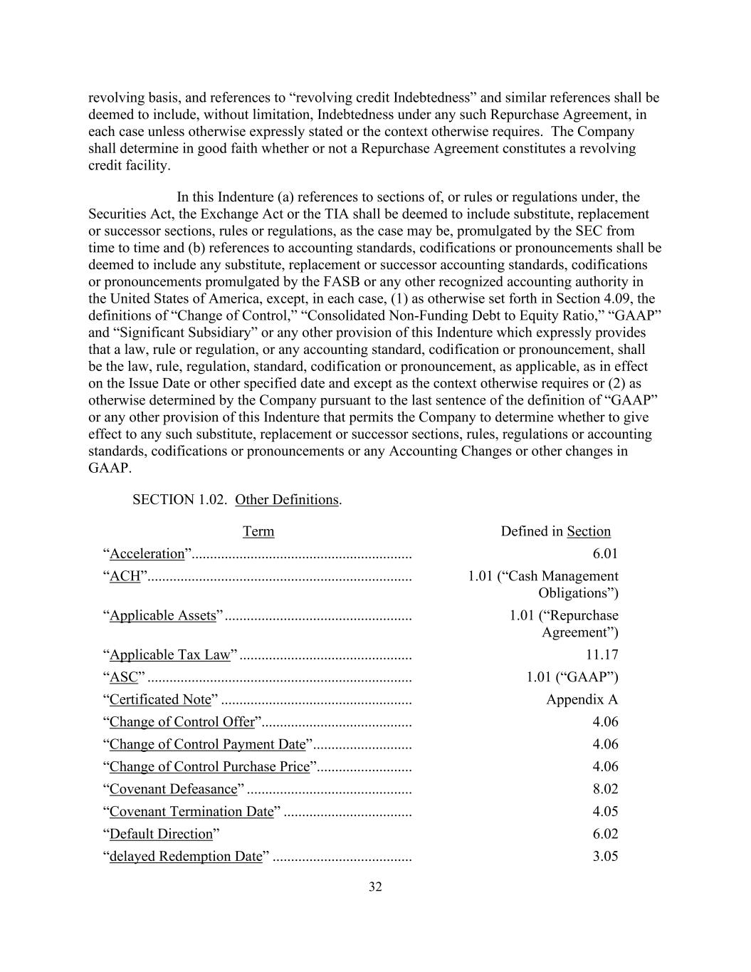 32循环基础,提及“循环信用债务”和类似的提法应被视为包括但不限于任何此类回购协议下的债务,在每种情况下,除非另有明确说明或上下文另有要求。公司应善意确定回购协议是否构成循环信贷额度。在本义齿中(a)提及《证券法》、《交易法》或TIA的章节或根据其制定的规则或条例,应被视为包括SEC不时颁布的替代、替代或继承的章节、规则或条例(视情况而定),以及(b)提及会计准则、编纂或公告应被视为包括FASB或美利坚合众国任何其他公认会计机构颁布的任何替代、替代或继承的会计准则、编纂或公告,但在每种情况下,(1)第4.09节另有规定,“控制权变更”、“合并非融资性债务权益比”的定义,“GAAP”和“重要子公司”或本契约的任何其他条款,其中明确规定法律、规则或条例,或任何会计准则、编纂或公告,应为适用的法律、规则、条例、标准、编纂或公告,在发布日期或其他指定日期有效,且除非上下文另有要求,或(2)公司根据“GAAP”定义的最后一句或本契约允许公司确定是否实施任何此类替代的任何其他条款另有决定,替换或继承部分、规则、条例或会计准则、编纂或公告或任何会计变更或GAAP的其他变更。第1.02节。其他定义。节“加速度”中定义的术语.......................................................................6.01“ACH”......................................................1.01(“现金管理义务”)“适用资产”......................................................1.01(“回购协议”)“适用税法”......................................1 1.17“ASC”......................................................1.01(“GAAP”)“有证票据”...................................。附录A“控制权变更要约”......................................4.06“控制权变更支付日”......................4.06“控制权变更购买价”......................4.06“契约失效”.......................................8.02“契约终止日”...................................4.05“违约方向”6.02“延迟兑付日”......................................3.05