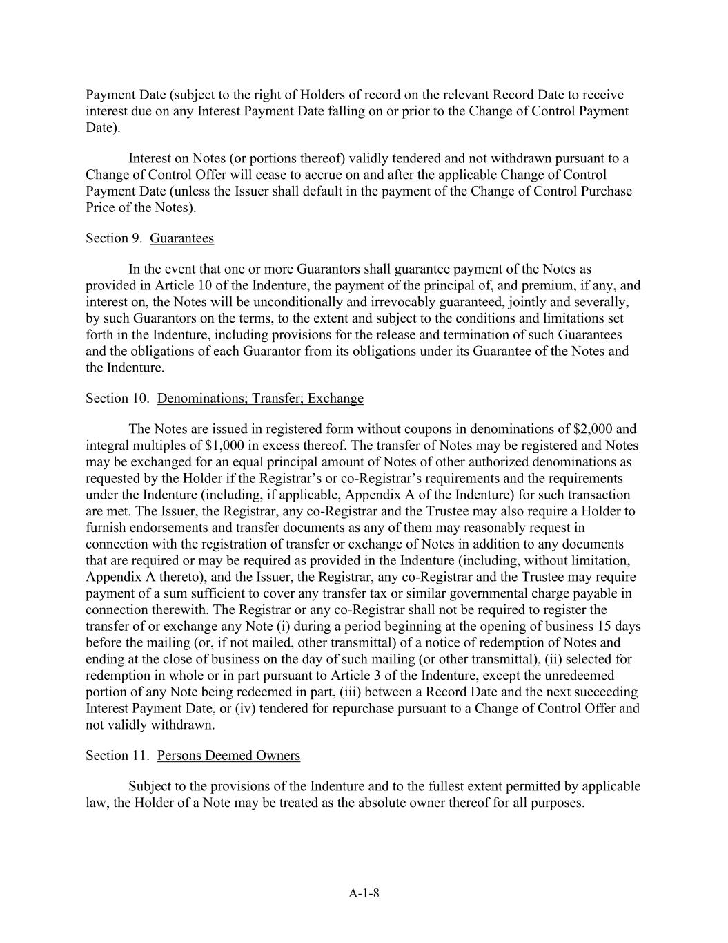 A-1-8支付日(受限于相关记录日期的记录持有人有权在控制权变更支付日或之前的任何付息日收取到期利息)。根据控制权变更要约有效投标且未被撤回的票据(或其部分)的利息将在适用的控制权变更支付日及之后停止累积(除非发行人拖欠票据的控制权变更购买价款的支付)。第9节。担保如果一名或多名担保人应按义齿第10条的规定担保票据的支付,票据的本金、溢价(如有)和利息的支付将由该等担保人根据义齿中规定的条件和限制,包括解除和终止该等担保的规定以及各担保人在其对票据和义齿的担保下的义务的规定,无条件和不可撤销地共同和个别地担保。第10节。面额;转让;交换票据以记名形式发行,不附带面额为2000美元和超过1000美元的整数倍的息票。票据的转让可予登记,如注册处处长或联席注册处处长的规定及根据义齿(如适用,包括义齿附录A)就该等交易作出的规定得到满足,则票据可按持有人的要求兑换等额本金额的其他授权面额票据。除义齿(包括但不限于其附录A)所规定或可能要求的任何文件外,发行人、注册官、任何共同注册官和受托人还可要求持有人提供其就转让或交换票据的登记所合理要求的背书和转让文件,以及发行人、注册官、任何共同注册官和受托人可要求支付一笔足以支付与此相关的任何转让税或类似政府押记的款项。注册处处长或任何共同注册处处长无须登记任何票据(i)的转让或交换,期间自票据赎回通知的邮寄(或,如未邮寄,则以其他递送方式)开始并于该等邮寄(或其他递送)当日的营业时间结束时开始,(ii)根据义齿第3条选择全部或部分赎回,但任何票据的未赎回部分被部分赎回,(iii)在记录日期至下一个利息支付日期之间,或(iv)根据控制权变更要约提呈回购而未获有效撤回。第11节。根据义齿的规定并在适用法律允许的最大范围内,对于所有目的,票据持有人可被视为票据的绝对所有者。