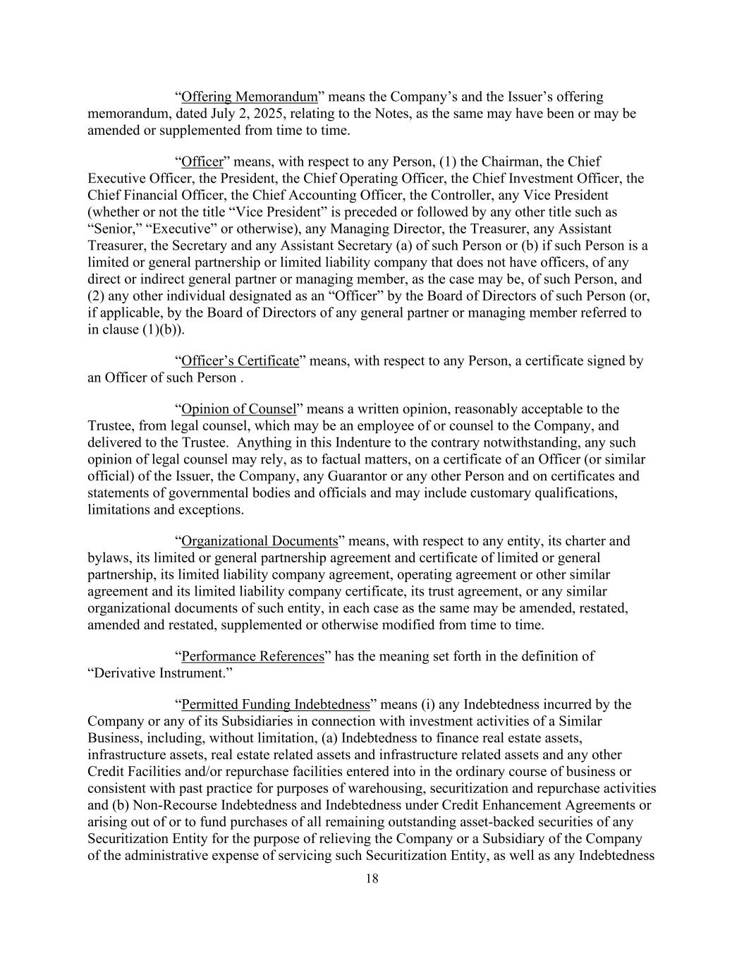 18“发售备忘录”指公司及发行人日期为2025年7月2日的有关票据的发售备忘录,因为该等备忘录可能已或可能不时修订或补充。“高级”是指,就任何人而言,(1)董事长、首席执行官、总裁、首席运营官、首席投资官、首席财务官、首席财务官、财务总监、任何副总裁(无论“副总裁”头衔之前或之后是否有“高级、“执行人员”或其他)、任何董事总经理、财务主管、任何助理财务主管、秘书及任何助理秘书(a)或(b)(如该人是没有高级人员的有限或普通合伙或有限责任公司)、该人的任何直接或间接普通合伙人或管理成员(视情况而定),以及(2)该人的董事会(或(如适用)第(1)(b)条所指的任何普通合伙人或管理成员的董事会)指定为“高级人员”的任何其他个人。“官员证书”就任何人而言是指由该人员签署的证书。“大律师意见”是指受托人合理接受的、来自法律顾问(可能是公司雇员或公司顾问)并交付给受托人的书面意见。尽管本指引中有任何相反的规定,就事实事项而言,法律顾问的任何该等意见可依赖发行人、公司、任何担保人或任何其他人的高级人员(或类似官员)的证书,以及政府机构和官员的证书和声明,并可包括惯常的资格、限制和例外情况。“组织文件”是指,就任何实体而言,其章程和细则、其有限合伙或普通合伙协议和有限合伙或普通合伙的证书、其有限责任公司协议、经营协议或其他类似协议及其有限责任公司证书、其信托协议或该实体的任何类似组织文件,在每种情况下均可不时修订、重述、修订和重述、补充或以其他方式修改。“业绩参考”具有“衍生工具”定义中阐述的含义。“许可融资债务”是指(i)公司或其任何子公司因类似业务的投资活动而产生的任何债务,包括但不限于(a)为房地产资产、基础设施资产、房地产相关资产和基础设施相关资产以及在正常业务过程中订立或为仓储目的与以往惯例一致的任何其他信贷融资和/或回购融资而产生的债务,证券化和回购活动以及(b)信用增进协议项下的无追索权债务和债务,或由购买任何证券化实体的所有剩余未偿资产支持证券所产生或为购买任何证券化实体的所有剩余未偿资产支持证券提供资金,目的是免除公司或公司的子公司为该证券化实体提供服务的管理费用,以及任何债务