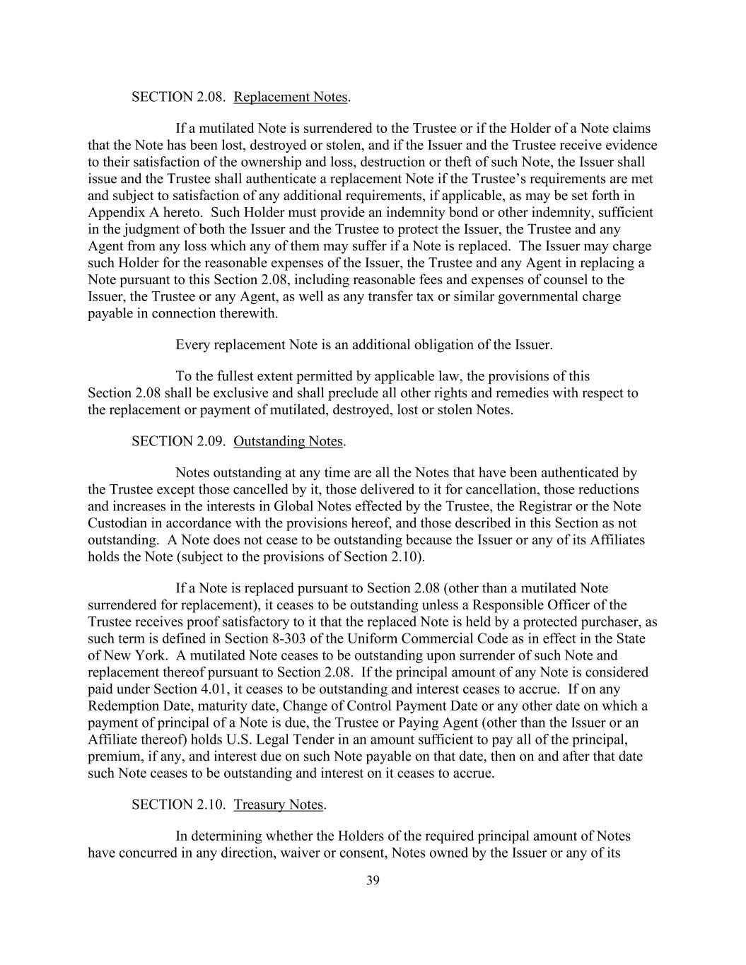 39第2.08款。替换说明。如果一张残缺的票据被交还给受托人,或者如果一张票据的持有人声称该票据已经丢失、销毁或被盗,并且如果发行人和受托人收到的证据使他们对该票据的所有权和丢失、销毁或被盗感到满意,则发行人应在满足受托人的要求并在满足任何附加要求(如适用)的情况下(如适用)(如本协议附录A所述)的情况下)发行替代票据,并且受托人应对其进行认证。此类持有人必须提供弥偿保证金或其他弥偿,在发行人和受托人双方的判断中足以保护发行人、受托人和任何代理人免受他们中的任何人在票据被替换时可能遭受的任何损失。发行人可以向该持有人收取发行人、受托人和任何代理人根据本条第2.08款更换票据的合理费用,包括向发行人、受托人或任何代理人提供法律顾问的合理费用和开支,以及与此有关的任何转让税或类似的政府收费。每一张置换票据都是发行人的一项额外义务。在适用法律允许的最大范围内,本节2.08的规定应是排他性的,并应排除与替换或支付残缺、毁坏、遗失或被盗票据有关的所有其他权利和补救办法。第2.09节。未付票据。任何时候未偿还的票据是指除其注销的票据、交付给其注销的票据、由受托人、书记官长或票据托管人根据本协议规定实施的全球票据权益的减少和增加以及本节中描述为未偿还的票据之外的所有已由受托人认证的票据。票据不会因为发行人或其任何关联公司持有票据而停止未偿还(受第2.10节规定的约束)。如果票据根据第2.08条被替换(交还以供替换的残缺票据除外),则该票据不再未清偿,除非受托人的负责官员收到令其满意的证明,证明被替换的票据由受保护的购买者持有,因为该术语在纽约州有效的《统一商法典》第8-303条中定义。根据第2.08节交出残缺的票据并予以替换后,该票据即停止未清偿。如果任何票据的本金金额被视为根据第4.01条已支付,则该票据不再未偿还,利息也不再产生。如果在任何赎回日、到期日、控制权变更支付日或票据本金到期支付的任何其他日期,受托人或付款代理人(发行人或其关联公司除外)持有的美国法定投标书的金额足以支付在该日期应付的该票据的所有本金、溢价(如有)和到期利息,则在该日期及之后,该票据不再未偿还,其利息也不再产生。第2.10节。国库券。在确定所需本金金额的票据持有人是否已同意任何指示、放弃或同意、发行人拥有的票据或其任何