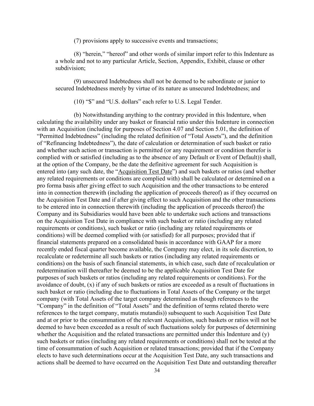 34(7)条适用于先后发生的事件和交易;(8)“此处”、“此处”及其他类似含义的词语是指本义齿整体,而不是指任何特定的条款、节、附录、附件、条款或其他细分;(9)无担保债务不应仅因其作为无担保债务的性质而被视为有担保债务的次级或次级;(10)“$”和“美元”各指美国法定投标。(b)尽管本契约另有相反规定,在计算与收购有关的本契约项下任何篮子或财务比率下的可用性时(包括就第4.07条和第5.01条而言,“许可债务”的定义(包括“总资产”的相关定义),以及“再融资债务”的定义),计算或确定该篮子或比率的日期,以及该行动或交易是否被允许(或其任何要求或条件是否得到遵守或满足(包括关于不存在任何违约或违约事件),根据公司的选择,为就该收购事项订立最终协议的日期(任何该等日期,“收购测试日期”)及该等篮子或比率(以及是否遵守任何相关规定或条件)须于该等收购及将就该等收购订立的其他交易(包括应用其所得款项)生效后按备考基准计算或厘定,犹如其发生于收购测试日期及如果在实施该等收购及将就该等收购订立的其他交易(包括应用其所得款项)后,公司及其附属公司本可在收购测试日期按照该篮子或比率(包括任何相关规定或条件)进行该等行动及交易,此类篮子或比率(包括任何相关要求或条件)将被视为符合(或满足)所有目的;前提是,如果根据公认会计原则为最近结束的财政季度编制的合并财务报表可用,公司可自行决定根据此类财务报表重新计算或重新确定所有此类篮子或比率(包括任何相关要求或条件),在这种情况下,此后,此类重新计算或重新确定的日期将被视为此类篮子或比率(包括任何相关要求或条件)的适用收购测试日期。为免生疑问,(x)如任何该等篮子或比率因该等篮子或比率的波动(包括由于公司或目标公司的总资产波动(目标公司的总资产确定时,犹如在“总资产”的定义中提述“公司”以及与之相关的术语的定义经比照是提述目标公司))而在该收购测试日期之后以及在相关收购完成时或之前被超过,此类篮子或比率将不会被视为已因此类波动而被超过,仅用于确定收购和相关交易是否在本契约下被允许,以及(y)此类篮子或比率(包括任何相关要求或条件)不得在完成此类收购或相关交易时进行测试;但如果公司选择在收购测试日期发生此类确定,则任何此类交易和行动应被视为已在收购测试日期发生并在其后未完成