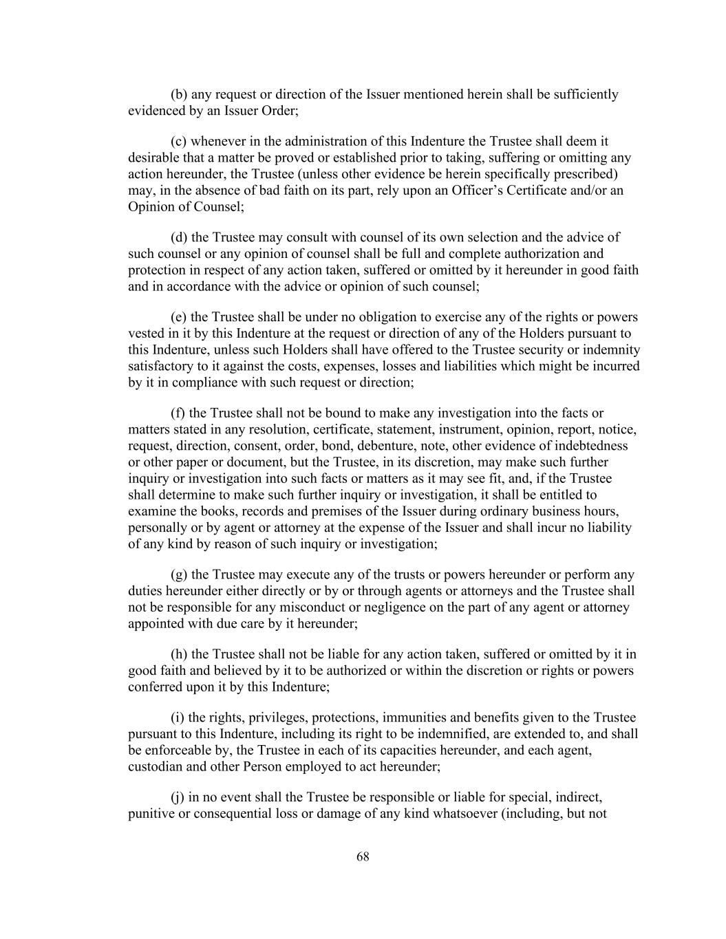 68(b)此处提及的发行人的任何请求或指示应以发行人令为充分证据;(c)每当在管理本义齿时,受托人在根据本义齿采取、遭受或遗漏任何行动之前认为某事项被证明或确立是可取的,受托人(除非此处特别规定的其他证据)可在其方面没有恶意的情况下,(d)受托人可向其本身选定的大律师谘询,而该大律师的意见或大律师的任何意见,须就所采取的任何行动获得充分及完整的授权及保障,其根据本协议善意并根据该大律师的意见或意见而遭受或遗漏;(e)受托人无须根据任何持有人依据本契约提出的要求或指示行使本契约赋予其的任何权利或权力,除非该等持有人已就费用、开支向受托人提供令其满意的担保或弥偿,(f)受托人无须就任何决议、证明书、声明、文书、意见、报告、通知、要求、指示、同意、命令、债券、债权证、票据、其他债务证据或其他文件或文件所述明的事实或事项进行任何调查,但受托人可酌情就其认为适当的事实或事项作出进一步查询或调查,而如受托人须决定作出进一步查询或调查,有权在正常营业时间内查阅发行人的簿册、记录和处所,亲自或由代理人或律师承担费用,费用由发行人承担,且不因此类查询或调查而承担任何类型的责任;(g)受托人可直接或由或通过代理人或律师执行本协议项下的任何信托或权力或履行本协议项下的任何职责,且受托人不对其根据本协议适当谨慎指定的代理人或律师的任何不当行为或疏忽负责;(h)受托人不对所采取的任何行动承担责任,其善意遭受或遗漏,并被其认为已获授权或在本契约赋予其的酌处权或权利或权力范围内;(i)根据本契约给予受托人的权利、特权、保护、豁免和利益,包括其获得赔偿的权利,延伸至以其在本契约项下的每一身份的受托人,以及根据本契约受雇行事的每一代理人、托管人和其他人,并由其强制执行;(j)在任何情况下,受托人均不对特别、间接、任何种类的惩罚性或后果性损失或损害(包括但不包括