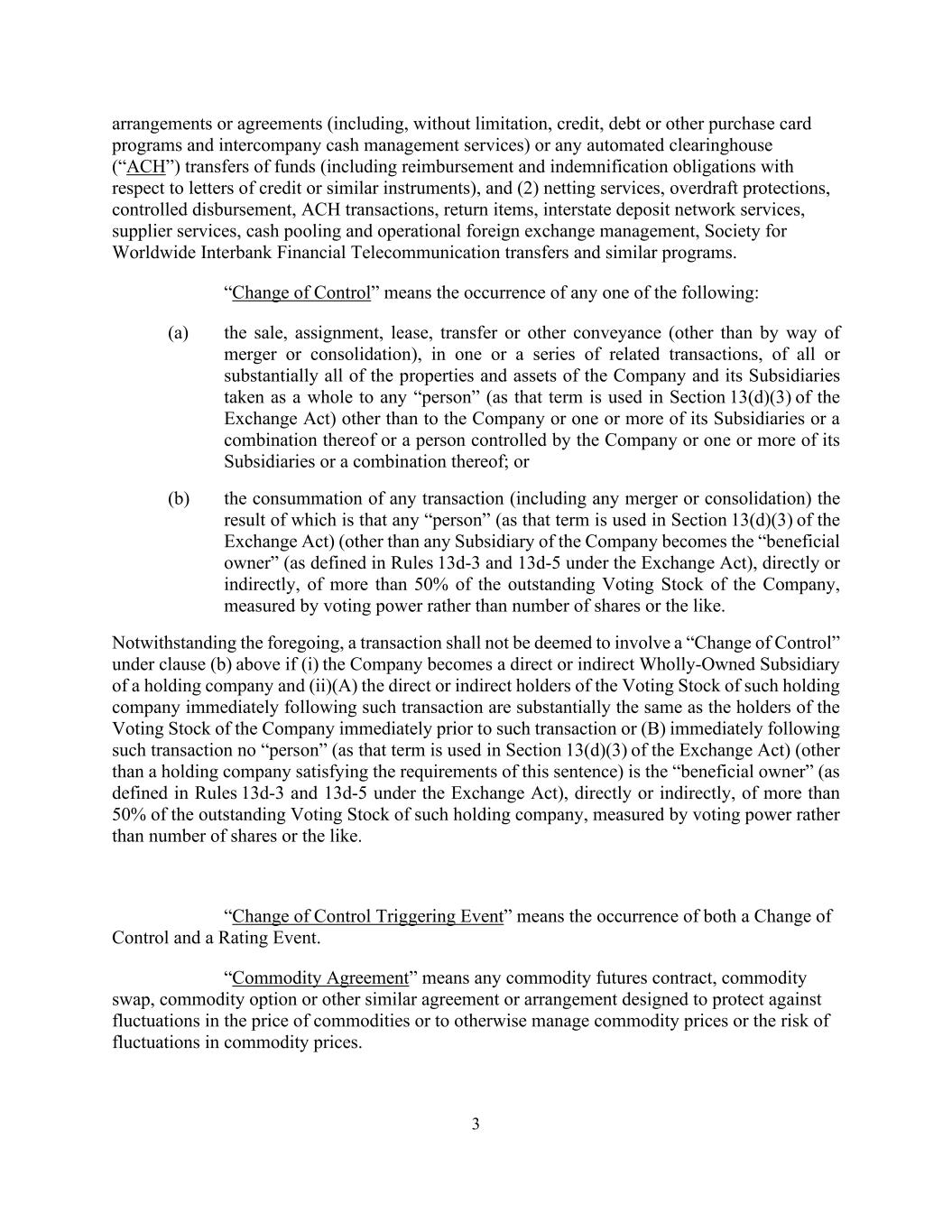 3项安排或协议(包括但不限于信贷、债务或其他购买卡计划以及公司间现金管理服务)或任何自动票据交换所(“ACH”)的资金转账(包括与信用证或类似工具有关的偿还和赔偿义务),以及(2)净额结算服务、透支保护、受控支付、ACH交易、退货项目、州际存款网络服务、供应商服务、现金池和可操作的外汇管理、世界银行间金融电信转账协会和类似计划。“控制权变更”是指发生以下任一情形:(a)出售、转让、租赁、转让或其他转让(以合并或合并方式除外),在一项或一系列关联交易中,公司及其附属公司的全部或几乎全部财产和资产整体上被视为任何“人”(如《交易法》第13(d)(3)条所用),但公司或其一个或多个附属公司或其组合或公司控制的人或其一个或多个附属公司或其组合除外;或(b)任何交易(包括任何合并或合并)的完成,其结果是任何“人”(如该术语在《交易法》第13(d)(3)条中使用)(公司的任何子公司直接或间接成为公司已发行有表决权股票50%以上的“实益拥有人”(定义见《交易法》第13d-3条和第13d-5条),以投票权而不是股份数量等衡量。尽管有上述情况,交易不应被视为涉及上述(b)条下的“控制权变更”如果(i)公司成为一家控股公司的直接或间接全资子公司,并且(ii)(a)紧接该交易后该控股公司的有表决权股票的直接或间接持有人与紧接该交易前的公司有表决权股票的持有人基本相同,或者(b)紧接该交易后没有“人”(因为该术语在《交易法》第13(d)(3)条中使用)(满足本句要求的控股公司除外)是“实益拥有人”(定义见《交易法》第13d-3条和第13d-5条),直接或间接,超过该控股公司已发行有表决权股份的50%,以投票权而非股份数量等衡量。“控制权变更触发事件”是指既发生控制权变更,又发生评级事件。“商品协议”是指旨在防范商品价格波动或以其他方式管理商品价格或商品价格波动风险的任何商品期货合约、商品互换、商品期权或其他类似协议或安排。