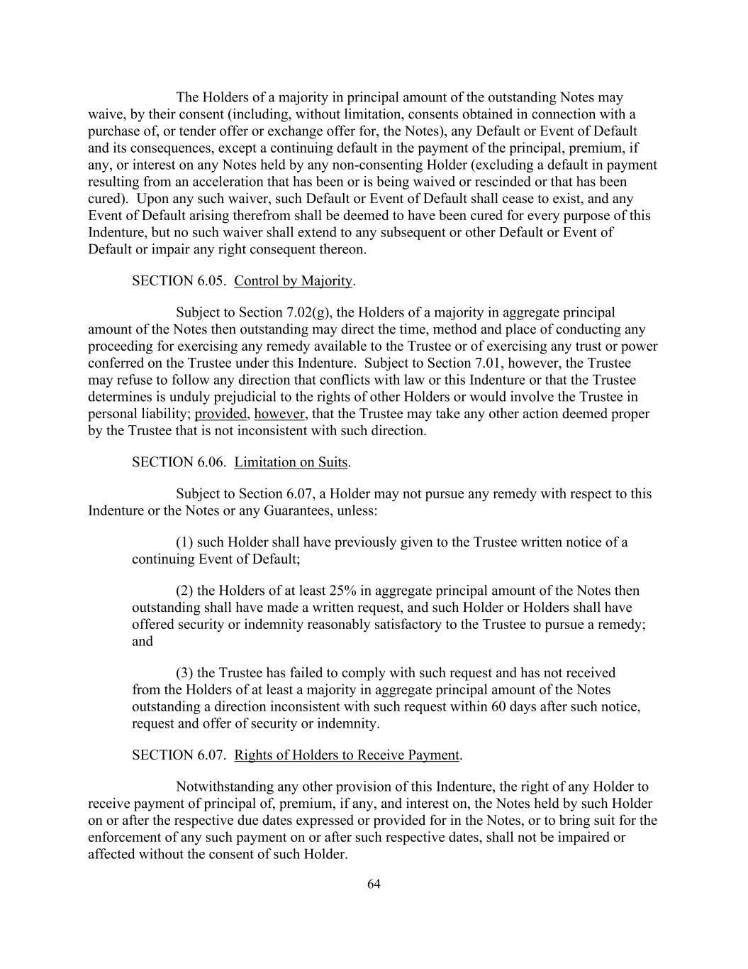 64未偿票据本金多数的持有人可经其同意(包括但不限于就购买票据、要约收购或交换要约而获得的同意)放弃任何违约或违约事件及其后果,但任何非同意持有人持有的任何票据的本金、溢价(如有)或利息的支付持续违约除外(不包括由于已经或正在被放弃或撤销或已得到纠正的加速导致的支付违约)。一旦作出任何该等放弃,该等违约或违约事件即告不复存在,而由此产生的任何违约事件须当作已就本契约的每项目的予以纠正,但该等放弃不得延伸至任何其后的或其他违约或违约事件,或损害由此产生的任何权利。第6.05节。多数人控制。除第7.02(g)条另有规定外,持有当时尚未偿付的票据本金总额多数的持有人可指示进行任何法律程序的时间、方法及地点,以行使受托人可用的任何补救措施或行使根据本指引授予受托人的任何信托或权力。然而,除第7.01条另有规定外,受托人可拒绝遵循任何与法律或本指引相冲突的指示,或受托人认为不适当地损害其他持有人的权利或将涉及受托人的个人责任的指示;但条件是,受托人可采取受托人认为适当但与该指示并不矛盾的任何其他行动。第6.06节。诉讼限制。除第6.07条另有规定外,持有人不得就本契约或票据或任何担保寻求任何补救,除非:(1)该持有人先前已就持续的违约事件向受托人发出书面通知;(2)持有当时未偿还的票据本金总额至少25%的持有人已提出书面请求,而该等持有人或持有人须已提供令受托人合理满意的担保或弥偿以寻求补救;及(3)受托人未能遵从该等要求,且在该等通知、要求及提供担保或弥偿后60天内,未从未偿还票据本金总额至少过半数的持有人收到与该等要求不一致的指示。第6.07节。持有人获得付款的权利。尽管有本契约的任何其他规定,任何持有人在票据中明示或规定的相应到期日或之后收取该持有人所持有的票据的本金、溢价(如有)及利息的权利,或在该相应日期或之后提起诉讼以强制执行任何该等付款的权利,未经该持有人同意,不得受到损害或影响。