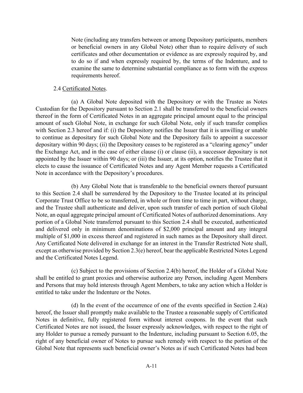 A-11票据(包括任何全球票据中的存管参与人、成员或受益所有人之间或之间的任何转让),但要求交付义齿条款明确要求的证书和其他文件或证据除外,并且在义齿条款明确要求的情况下这样做,并对其进行审查以确定实质上是否符合本协议的明确要求。2.4凭证式票据。(a)根据第2.1节交存于保存人或作为保存人的票据保管人交存于受托人的全球票据,须以经证明的票据形式转让予该票据的实益拥有人,其本金总额相当于该全球票据的本金总额,以换取该全球票据,只有在此种转让符合本协议第2.3节的情况下,并且在以下情况下:(i)存托人通知发行人,其不愿意或无法继续担任此类全球票据的存托人,且存托人未能在90天内指定继任存托人;(ii)存托人不再根据《交易法》注册为“清算机构”,并且在第(i)或第(ii)条的情况下,发行人未在90天内指定继任存托人;或(iii)发行人可自行选择,通知受托人,其选择促使发行凭证式票据,且任何代理成员根据存管人的程序要求凭证式票据。(b)任何可依据本条第2.4款转让予其实益拥有人的全球票据,须由保存人将其全部或不时部分转让予设于其主要公司信托办事处的受托人而不收取费用,而受托人须在转让该全球票据的每一部分时认证并交付认可面额的经证明票据的相等本金总额。根据本条2.4款转让的全球票据的任何部分,只应以本金2000美元的最低面额和超过1000美元的任何整数倍执行、认证和交付,并以保存人指示的名称登记。除本条例第2.3(e)条另有规定外,为换取转让受限制票据的权益而交付的任何凭证式票据,须载有适用的受限制票据图例及凭证式票据图例。(c)在符合本条例第2.4(b)条的规定下,全球票据持有人有权授予代理人,并以其他方式授权任何人,包括代理成员和可能通过代理成员持有权益的人,采取持有人根据契约或票据有权采取的任何行动。(d)如发生本条例第2.4(a)条所指明的事件之一,发行人须迅速向受托人提供合理供应的无息票的最终、全面登记形式的凭证式票据。在未发行此类凭证式票据的情况下,发行人明确承认,关于任何持有人根据义齿寻求补救的权利,包括根据第6.05条,票据的任何受益所有人有权就全球票据中代表此类受益所有人票据的部分寻求此类补救,就好像此类凭证式票据已