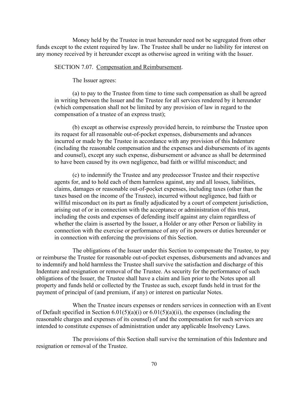 70除法律规定的范围外,受托人根据本协议以信托方式持有的资金无需与其他资金分离。除与发行人另有书面约定外,受托人对其在本协议项下收到的任何款项不承担利息责任。第7.07节。补偿和报销。发行人同意:(a)不时向受托人支付发行人与受托人就其根据本协议提供的所有服务以书面约定的补偿(该补偿不受有关明示信托受托人的补偿的任何法律规定的限制);(b)除本协议另有明文规定外,应受托人的请求偿还所有合理的自付费用,受托人根据本契约的任何规定招致或作出的付款和垫款(包括合理补偿以及其代理人和大律师的开支和垫款),但应确定为由其自身的疏忽、恶意或故意不当行为引起的任何费用、付款或垫款除外;(c)就任何和所有损失、责任、索赔、损害或合理的自付费用向受托人和任何前任受托人及其各自的代理人作出赔偿,并使他们各自免受损害,包括因接受或管理本信托而产生或与之相关的、由有管辖权的法院最终裁定的非过失、恶意或故意不当行为而招致的税款(基于受托人收入的税款除外),包括无论该债权是否由发行人主张的针对任何债权为自己进行辩护的费用和开支,持有人或任何其他人或法律责任,与根据本条例行使或执行其任何权力或职责有关,或与执行本条条文有关。发行人根据本条承担的赔偿受托人、支付或补偿受托人的合理自付费用、付款和垫款以及赔偿受托人并使其免受损害的义务,应在本契约的履行和解除以及受托人的辞职或撤职后继续有效。作为发行人履行该等义务的担保,受托人在票据之前对受托人本身持有或收取的所有财产和资金享有债权和留置权,但为支付特定票据的本金(以及溢价,如有)或利息而以信托方式持有的资金除外。当受托人就第6.01(5)(a)(i)或6.01(5)(a)(ii)条所指明的违约事件招致开支或提供服务时,该等服务的开支(包括其律师的合理收费及开支)及补偿拟构成任何适用的破产法下的行政开支。本节的规定应在本契约终止和受托人辞职或被免职后继续有效。
