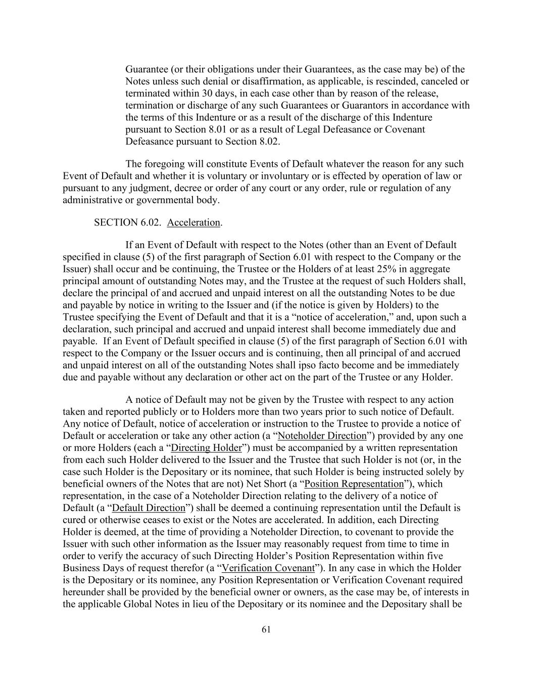 61对票据的担保(或其在其担保下的义务,视情况而定),除非此类拒绝或否认(如适用)在30天内被撤销、取消或终止,在每种情况下,不是由于根据本义齿条款解除、终止或解除任何此类担保或担保人,或由于根据第8.01条解除本义齿或由于根据第8.02条法律失效或契约失效。无论任何此类违约事件的原因是什么,以及它是自愿还是非自愿的,还是由法律运作或根据任何法院的任何判决、法令或命令或任何行政或政府机构的任何命令、规则或条例实施的,上述情况都将构成违约事件。第6.02节。加速。如有关票据的违约事件(第6.01条第1款第(5)款就公司或发行人指明的违约事件除外)须发生并持续进行,则受托人或未偿还票据本金总额至少25%的持有人可,而受托人应该等持有人的要求,通过向发行人发出书面通知和(如果该通知是由持有人发出的)向受托人指明违约事件并且该通知是“加速通知”的方式,宣布所有未偿还票据的本金以及应计和未付利息到期应付,并且在作出此类声明后,该本金以及应计和未付利息应立即到期应付。如第6.01条第1款第(5)款指明的与公司或发行人有关的违约事件发生且仍在继续,则所有未偿还票据的所有本金以及应计和未付利息应依事实成为并立即到期和应付,而无须受托人或任何持有人作出任何声明或其他作为。受托人不得就已采取和公开报告的任何行动或在该违约通知发出两年以上之前向持有人发出违约通知。任何一名或多名持有人(每一名“指示持有人”)提供的任何违约通知、加速通知或指示受托人提供违约或加速通知或采取任何其他行动(“票据持有人指示”),必须附有每一名该等持有人向发行人和受托人交付的书面陈述,表明该持有人不是(或者,在该持有人是存托人或其代名人的情况下,该持有人是仅由票据的实益拥有人指示而不是)净空头(“头寸表示”),该陈述,就票据持有人而言,与交付违约通知有关的指示(“违约指示”)应被视为持续陈述,直至违约被纠正或以其他方式不复存在或票据被加速。此外,在提供票据持有人指示时,每个指示持有人被视为承诺向发行人提供发行人可能不时合理要求的其他信息,以便在提出要求后的五个工作日内验证该指示持有人的头寸陈述的准确性(“验证契约”)。在任何情况下,如持有人是保存人或其代名人,则本条例所规定的任何立场陈述或核实契约须由适用的全球票据的权益的实益拥有人或拥有人(视属何情况而定)提供,以代替保存人或其代名人,而保存人须