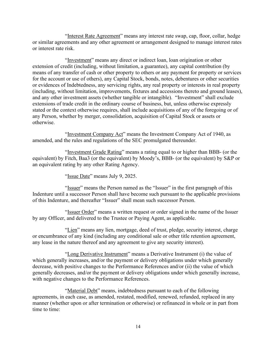 14“利率协议”是指任何利率互换、上限、下限、项圈、对冲或类似协议以及旨在管理利率或利率风险的任何其他协议或安排。“投资”指任何直接或间接贷款、贷款发放或其他信贷展期(包括但不限于担保)、任何出资(通过向他人转让现金或其他财产或为他人开户或使用的任何财产或服务付款)、任何股本、债券、票据、债权证或其他证券或债务证据、任何服务权、不动产的任何不动产或权益(包括但不限于改良、固定装置及其附属物和地面租赁),以及任何其他投资资产(无论有形或无形)。“投资”不包括在正常业务过程中的贸易信贷展期,但除非另有明确说明或上下文另有要求,应包括对上述任何一项或任何人的收购,无论是通过合并、合并、收购股本或资产或其他方式。“投资公司法”是指经修订的1940年《投资公司法》,以及SEC据此颁布的规则和条例。“投资级评级”是指惠誉给予等于或高于BBB-(或同等评级)、穆迪给予Baa3(或同等评级)、标普给予BBB-(或同等评级)或任何其他评级机构给予同等评级。“发行日”是指2025年7月9日。“发行人”是指在本义齿第一款中被称为“发行人”的人,直到根据本义齿的适用条款,一个继承人成为该人为止,其后“发行人”是指该继承人。“发行人命令”是指由任何官员以发行人名义签署并交付给受托人或付款代理人(如适用)的书面请求或命令。“留置权”是指任何留置权、抵押、信托契据、质押、担保权益、押记或任何种类的产权负担(包括任何有条件出售或其他所有权保留协议、其性质的任何租赁以及任何给予任何担保权益的协议)。“多头衍生工具”是指(i)价值普遍增加的衍生工具,和/或根据其承担的付款或交付义务普遍减少,业绩参考发生积极变化和/或(ii)价值普遍减少,和/或根据其承担的付款或交付义务普遍增加,业绩参考发生消极变化的衍生工具。“重大债务”是指,根据以下各项协议(在每种情况下,经修订、重述、修改、续期、退还、以任何方式(无论是在终止时或终止后或以其他方式)置换或不时全部或部分再融资的债务: