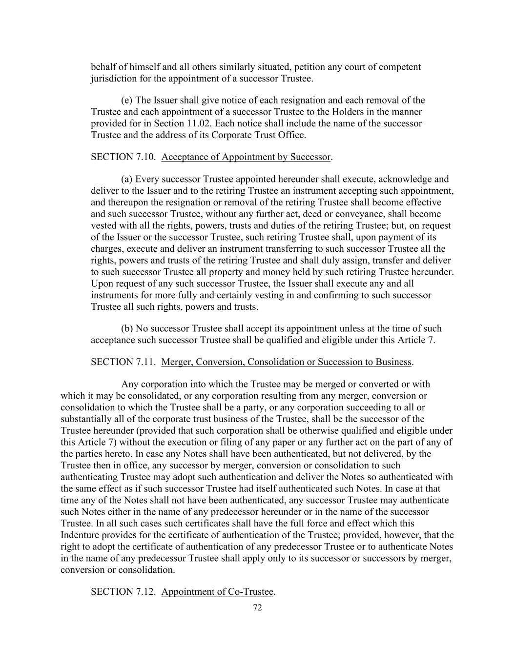 72代表自己和所有其他处境类似的人,向任何有管辖权的法院申请指定继任受托人。(e)发行人须按第11.02条规定的方式,向持有人发出每项辞职及每项罢免受托人及每项委任继任受托人的通知。每份通知应包括继任受托人的名称及其公司信托办公室的地址。第7.10节。接任者接受委任。(a)根据本协议委任的每名继任受托人,须签立、承认并向发行人及退任受托人交付一份接受该委任的文书,据此,退任受托人的辞职或免职即生效,而该继任受托人在无任何进一步作为、契据或转易的情况下,即获授予退任受托人的所有权利、权力、信托及职责;但应发行人或继任受托人的要求,该退任受托人须在其费用付清后签立并交付一份文书,将所有权利转让予该继任受托人,退任受托人的权力及信托,并须将该退任受托人根据本协议持有的所有财产及款项妥为转让、转让及交付予该继任受托人。根据任何该等继任受托人的要求,发行人应签署任何及所有文书,以便更充分和肯定地将所有该等权利、权力和信托归属并确认给该继任受托人。(b)任何继任受托人不得接受其委任,除非在接受时该继任受托人应符合本条第7款规定的资格和资格。第7.11节。合并、转换、合并或继承业务。受托人可合并或转换成的任何公司或与其合并的任何公司,或因受托人应为一方的任何合并、转换或合并而产生的任何公司,或任何继承受托人全部或几乎全部公司信托业务的公司,均为本协议项下受托人的继承者(但该公司应具有本条第7条规定的其他资格和资格),而无需签署或归档任何文件或本协议任何一方的任何进一步行为。如任何票据已由当时在任的受托人认证,但未交付,则任何以合并、转换或合并方式向该认证受托人作出的继承人可采用该认证,并交付经如此认证的票据,其效力犹如该继任受托人本身已认证该等票据一样。如届时任何票据未获认证,任何继任受托人可以本协议下任何前任的名义或以继任受托人的名义认证该等票据。在所有这些情况下,这些证书应具有本义齿对受托人认证证书规定的全部效力和效力;但是,采用任何前任受托人的认证证书或以任何前任受托人的名义认证票据的权利应仅适用于其通过合并、转换或合并方式的继任者或继任者。第7.12节。委任共同受托人。