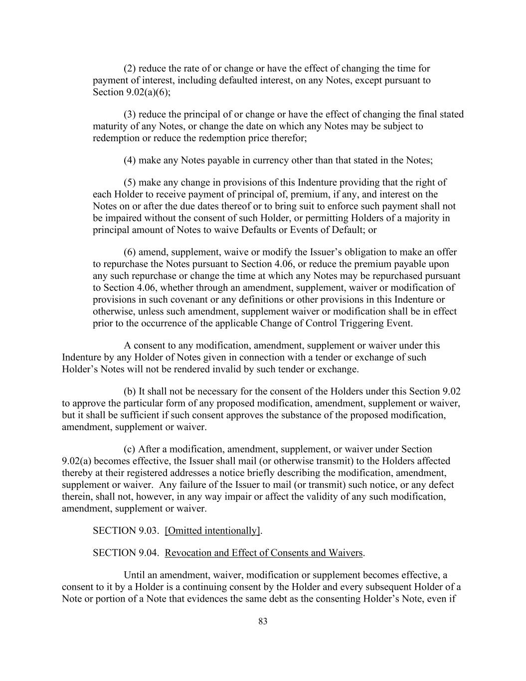 83(2)除依据第9.02(a)(6)条外,降低任何票据的利率或改变或具有改变支付利息(包括违约利息)的时间的效果;(3)减少任何票据的本金或改变或具有改变任何票据的最终声明期限的效果,或更改任何票据可能被赎回的日期或降低其赎回价格;(4)使任何票据以票据内所述货币以外的货币支付;(5)对本契约的条文作出任何更改,规定每名持有人在票据到期日期或之后收取票据本金、溢价(如有)及利息的权利或提起诉讼以强制执行该等付款的权利,未经该持有人同意,不得受损,或允许票据本金多数的持有人放弃违约或违约事件;或(6)修订、补充、放弃或修改发行人根据第4.06条提出回购票据要约的义务,或减少任何该等回购时应付的溢价或更改任何票据根据第4.06条可回购的时间,不论是通过修订、补充、放弃或修改该等契诺中的规定或本契约中的任何定义或其他规定或其他方式,除非该等修订,补充豁免或修改应在适用的控制权变更触发事件发生前生效。任何票据持有人就该持有人的票据的投标或交换而给予的对本契约下的任何修改、修订、补充或放弃的同意,不会因该投标或交换而失效。(b)根据本条第9.02条批准任何建议的修改、修订、补充或放弃的特定形式,无须取得持有人的同意,但如该同意批准建议的修改、修订、补充或放弃的实质内容,则该同意即为足够。(c)根据第9.02(a)条作出的修改、修订、补充或放弃生效后,发行人须在其注册地址向受此影响的持有人邮寄(或以其他方式传送)一份简述该修改、修订、补充或放弃的通知。但是,发行人未能邮寄(或传送)该通知或其中的任何缺陷,不得以任何方式损害或影响任何该等修改、修正、补充或放弃的有效性。第9.03节。【故意省略】。第9.04节。撤销及同意及豁免的效力。在一项修正、放弃、修改或补充生效之前,持有人对它的同意是持有人和票据的每一个后续持有人的持续同意,证明与同意持有人的票据相同的债务,即使