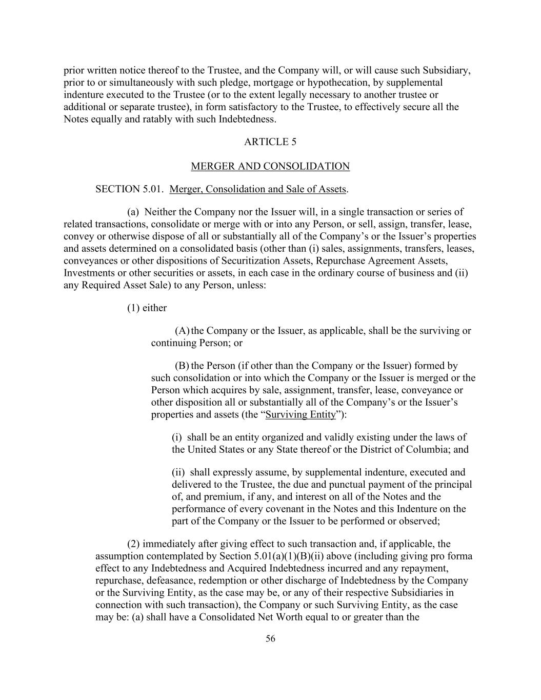 56事先向受托人发出书面通知,而公司将或将促使该附属公司在该等质押、抵押或抵押之前或同时通过以受托人满意的形式向受托人(或在法律上对另一受托人或额外或单独的受托人必要的范围内)签立的补充契约,有效地以该等债务平等和按比例担保所有票据。第五条合并、合并第5.01款。合并、合并、出售资产。(a)公司或发行人均不会在单一交易或一系列相关交易中与任何人合并或合并,或出售、转让、转让、租赁、转让或以其他方式处置公司或发行人在综合基础上确定的全部或几乎全部财产和资产(不包括(i)在正常业务过程中向任何人出售、转让、转让、转让、租赁、转让或以其他方式处置证券化资产、回购协议资产、投资或其他证券或资产,以及(ii)任何规定的资产出售),除非:(1)(a)公司或发行人(如适用)为存续或持续的人;或(b)由该等合并所组成的人(如公司或发行人除外)或公司或发行人并入的人或通过出售、转让、转让、租赁取得的人,转让或以其他方式处置公司或发行人的全部或几乎全部财产和资产(“存续实体”):(i)应是根据美国或其任何州或哥伦比亚特区的法律组织和有效存在的实体;(ii)应通过补充契约明确承担到期和按时支付本金和溢价(如有),及所有票据的利息,以及公司或发行人须履行或遵守的票据及本订约中的每项契诺的履行;(2)紧接在该交易生效后,以及(如适用)上文第5.01(a)(1)(b)(ii)条所设想的假设(包括给予公司或存续实体(视属何情况而定)所招致的任何债务及所得债务的任何偿还、回购、撤销、赎回或以其他方式解除债务,或其各自的任何附属公司与该交易有关),公司或该等存续实体(视属何情况而定):(a)合并净值应等于或大于