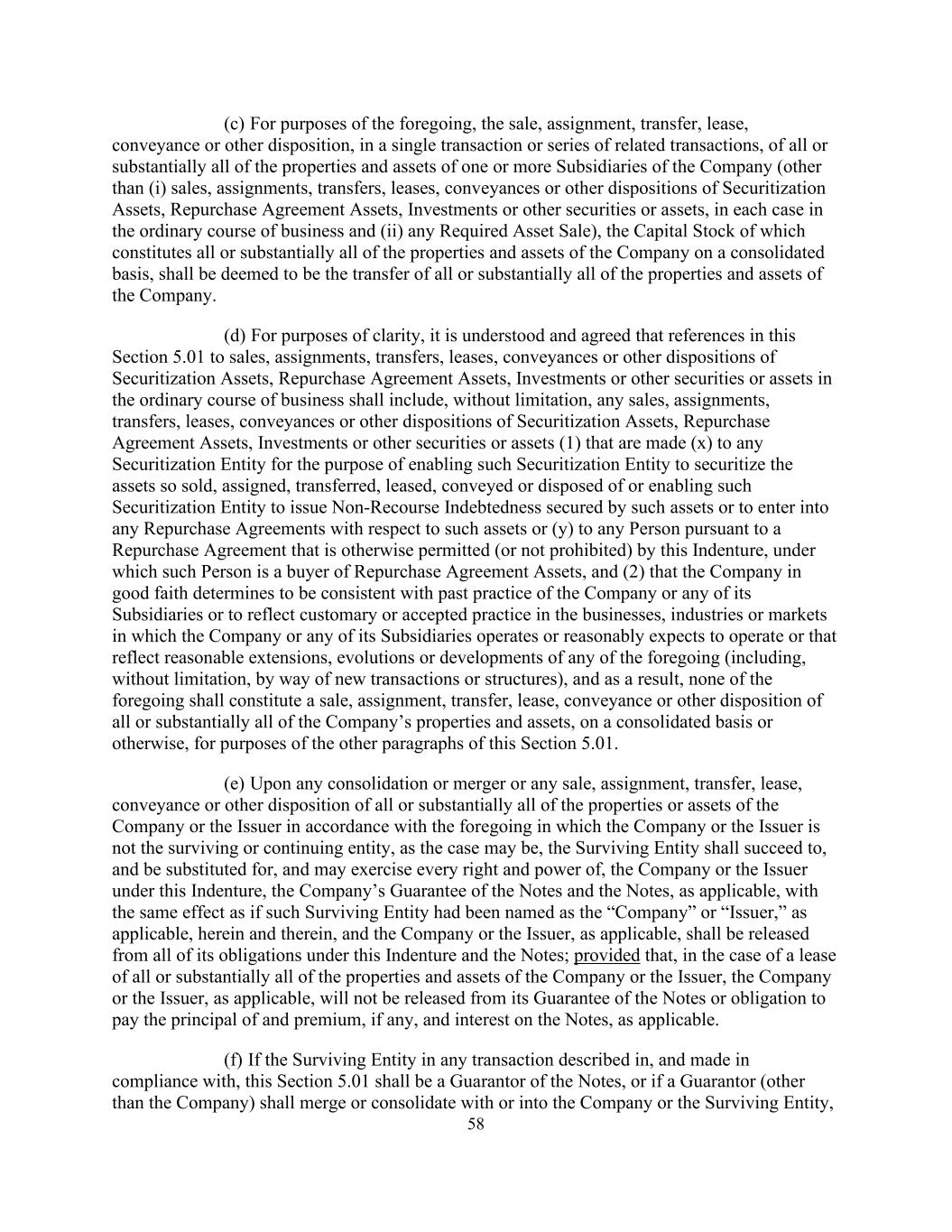 58(c)就前述而言,在单一交易或一系列相关交易中出售、转让、转让、租赁、转易或以其他方式处置公司一个或多个子公司的全部或几乎全部财产和资产(但(i)出售、转让、转让、租赁、转易或以其他方式处置证券化资产、回购协议资产、投资或其他证券或资产除外,在每种情况下,在正常业务过程中,以及(ii)任何所需的资产出售),其股本构成公司在合并基础上的全部或基本全部财产和资产,应被视为公司全部或基本全部财产和资产的转让。(d)为清楚起见,理解并一致认为,本条第5.01款中提及证券化资产、回购协议资产、投资或其他证券或资产在正常经营过程中的出售、转让、转让、租赁、转易或其他处分,应包括但不限于向任何证券化实体作出的任何出售、转让、转让、租赁、转易或证券化资产、回购协议资产、投资或其他证券或资产的其他处分(1),目的是使该证券化实体能够将如此出售、转让、转让、租赁的资产证券化,转让或处置或使该证券化实体能够发行由该等资产担保的无追索权债务或就该等资产订立任何回购协议,或(y)根据本契约另有许可(或未禁止)的回购协议向任何人,根据该协议,该人是回购协议资产的买方,以及(2)公司善意地确定与公司或其任何子公司的过去惯例一致或反映业务中的习惯或公认惯例,公司或其任何附属公司经营或合理预期经营的行业或市场,或反映上述任何一项的合理延伸、演变或发展(包括但不限于通过新的交易或结构),因此,就本条第5.01款的其他段落而言,上述任何一项均不构成在综合基础上或以其他方式出售、转让、转让、租赁、转让或以其他方式处置公司的全部或基本全部财产和资产。(e)在公司或发行人并非存续或持续实体(视情况而定)的任何合并或合并或根据前述出售、转让、转让、租赁、转易或以其他方式处置公司或发行人的全部或基本全部财产或资产时,存续实体应继承、取代并可行使公司或发行人在本契约、公司对票据和票据的担保(如适用)下的所有权利和权力,具有与此类存续实体被命名为“公司”或“发行人”相同的效果,如适用,本协议及本协议及本协议内,公司或发行人(如适用)应免除其在本契约及票据项下的所有义务;但如租赁公司或发行人的全部或几乎全部财产和资产,则公司或发行人(如适用)将不会免除其对票据的担保或支付票据本金及溢价(如有)及利息(如适用)的义务。(f)如本条第5.01条所述的任何交易中的存续实体,并遵照本条作出,则该存续实体应为票据的担保人,或如担保人(公司除外)应与公司或存续实体合并或合并,或并入公司或存续实体,