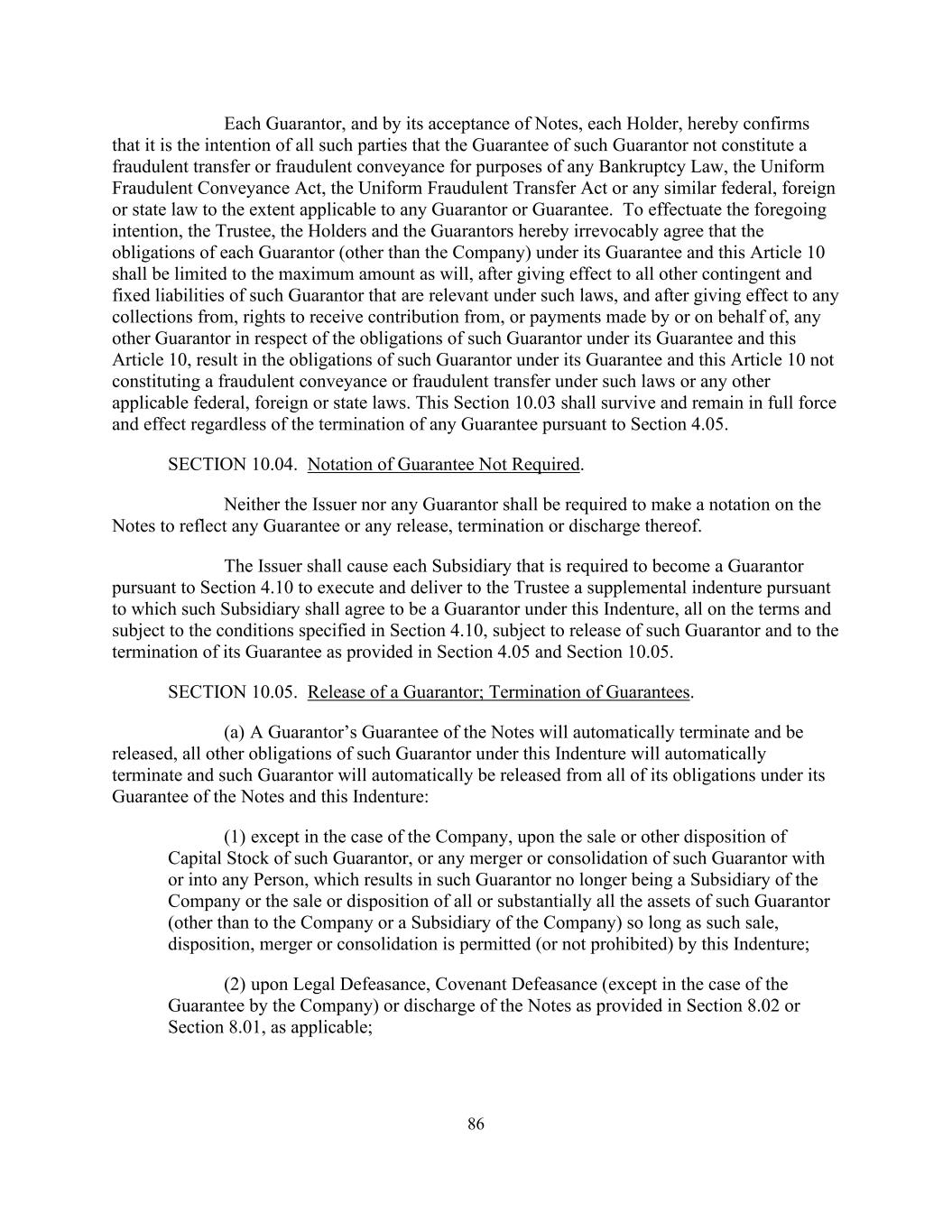86每一担保人及其接受票据、每一持有人在此确认,所有此类当事人的意图是,就任何破产法、《统一欺诈转让法》、《统一欺诈转让法》或任何类似的联邦、外国或州法律而言,在适用于任何担保人或担保的范围内,该担保人的担保不构成欺诈性转让或欺诈性转让。为实现上述意图,受托人、持有人和担保人在此不可撤销地同意,各担保人(公司除外)在其担保和本第十条项下的义务,在该担保人在该等法律下相关的所有其他或有负债和固定负债生效后,并在其任何收款、收取分担权、或由其或代表其支付的款项生效后,以最高金额为限,任何其他担保人就该担保人在其担保和本条第10项下的义务导致该担保人在其担保和本条第10项下的义务不构成此类法律或任何其他适用的联邦、外国或州法律下的欺诈性转让或欺诈性转让。无论根据第4.05条终止任何担保,本条10.03均应继续有效,并保持完全有效。第10.04节。不需要担保的记号。发行人或任何担保人均无须在票据上作出注明,以反映任何担保或任何解除、终止或解除。发行人应促使根据第4.10条被要求成为担保人的每个子公司签署并向受托人交付一份补充契约,据此,该子公司应同意成为本契约下的担保人,所有这些都是根据第4.10条规定的条款和条件,但须解除该担保人的资格并根据第4.05条和第10.05条的规定终止其担保。第10.05节。解除担保人;解除担保。(a)担保人对票据的担保将自动终止和解除,该担保人在本契约下的所有其他义务将自动终止,该担保人将自动解除其在其对票据和本契约的担保下的所有义务:(1)除公司外,在该担保人的股本出售或以其他方式处置,或该担保人与任何人合并或合并为任何人时,导致该担保人不再是公司的附属公司或出售或处置该担保人的全部或实质上全部资产(公司或公司的附属公司除外),只要该出售、处置、合并或合并是本契约允许(或不禁止)的;(2)在法律失效、契约失效(公司担保的情况除外)或根据适用的第8.02条或第8.01条的规定解除票据时;