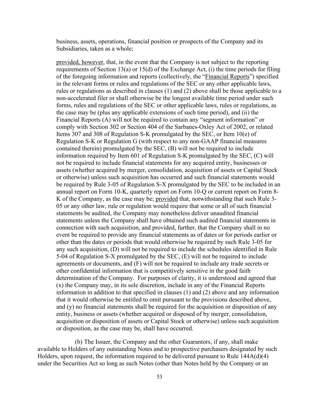 公司及其子公司的53项业务、资产、运营、财务状况或前景,作为一个整体;但前提是,如果公司不受《交易法》第13(a)或15(d)节报告要求的约束,(i)SEC或任何其他适用法律的相关表格或规则和条例中规定的提交上述信息和报告(统称“财务报告”)的时间段,上文第(1)和(2)条所述的规则或条例应是适用于非加速申报人的规则或条例,或应是SEC的此类表格、规则和条例或其他适用法律、规则或条例(视情况而定)下的最长可用时间段(加上此类时间段的任何适用延长),以及(ii)财务报告(a)将不需要包含任何“分部信息”或符合2002年《萨班斯-奥克斯利法案》第302条或第404条,或SEC颁布的S-K条例的相关项目307和308,或SEC颁布的S-K条例第10(e)项或G条例(关于其中包含的任何非GAAP财务措施),(b)将不需要包括SEC颁布的S-K条例第601项要求的信息,(c)将不需要包括任何被收购实体、业务或资产的财务报表(无论是通过合并、合并获得,收购资产或股本或其他情况),除非已发生此类收购,且SEC颁布的S-X条例第3-05条将要求此类财务报表包含在公司的10-K表格年度报告、10-Q表格季度报告或8-K表格当前报告中(视情况而定);但前提是,尽管此类规则第3-05条或任何其他法律、规则或条例将要求对部分或全部此类财务报表进行审计,尽管如此,公司仍可交付未经审计的财务报表,除非公司已获得与此类收购有关的此类经审计的财务报表,并进一步规定,在任何情况下,公司均不得被要求提供截至日期或更早期间或该规则第3-05条对任何此类收购所要求的日期或期间以外的任何财务报表,(d)将不需要包括SEC颁布的S-X条例第5-04条中确定的附表,(e)将不需要包括协议或文件,及(F)将不会被要求包括任何商业秘密或其他机密资料,而这些资料在公司的善意判定中具有竞争敏感性。为清楚起见,理解并同意(x)公司可全权酌情在任何财务报告中包括除上文第(1)和(2)条规定的信息以及根据上述规定本应有权省略的任何信息,以及(y)任何实体、业务或资产(无论是通过合并、合并、收购或处置资产或股本或其他方式获得或处置)的收购或处置均无需财务报表,除非该收购或处置,视情况而定,应已发生。(b)发行人、公司和其他担保人(如有)应根据要求向任何未偿还票据的持有人和这些持有人指定的潜在购买者提供根据《证券法》第144A(d)(4)条规则要求交付的信息,只要这些票据(公司持有的票据或
