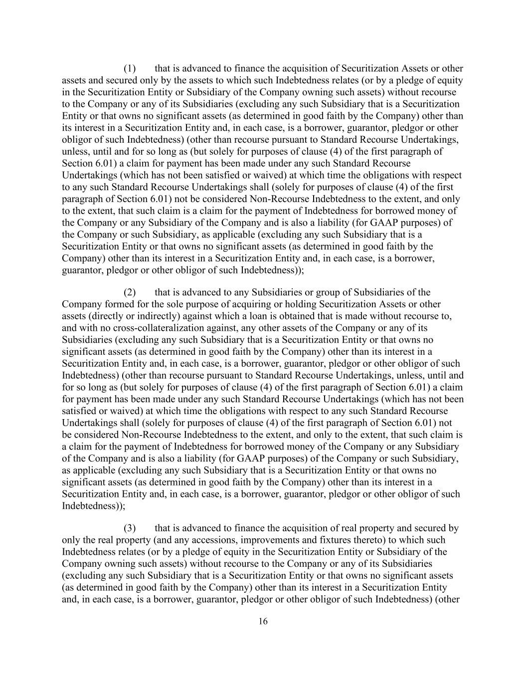16(1)为收购证券化资产或其他资产而垫资,且仅由与该等债务相关的资产(或以拥有该等资产的公司的证券化实体或附属公司的股权质押)作担保,而无需向公司或其任何附属公司(不包括任何该等附属公司为证券化实体或除其在证券化实体中的权益外不拥有任何重大资产(由公司善意确定),并且在每种情况下均为借款人、担保人,出质人或此类债务的其他债务人)(根据标准追索权承诺的追索权除外,除非,直到(但仅为第6.01条第一款第(4)款的目的)根据任何此类标准追索权承诺提出付款索赔(但尚未得到履行或放弃),此时与任何此类标准追索权承诺有关的义务(仅为第6.01条第一款第(4)款的目的)在以下范围内不被视为无追索权债务,并且仅在以下范围内,此类索赔是为支付公司或公司任何子公司的借款债务而提出的索赔,也是公司或该子公司(如适用)的负债(就公认会计原则而言)(不包括任何此类子公司,该子公司是证券化实体,或除其在证券化实体中的权益外不拥有任何重要资产(由公司善意确定),并且在每种情况下都是借款人、担保人,此类债务的出质人或其他义务人));(2)垫付给公司任何子公司或子公司集团,其唯一目的是收购或持有证券化资产或(直接或间接)获得贷款所针对的其他资产,且无追索权且无交叉抵押,公司或其任何子公司的任何其他资产(不包括作为证券化实体或除其在证券化实体中的权益外不拥有重大资产(由公司善意确定)的任何该等子公司,以及,在每一种情况下,是此类债务的借款人、担保人、出质人或其他债务人)(根据标准追索承诺的追索除外,除非,直到(但仅就第6.01条第一款第(4)款而言)已根据任何此类标准追索承诺提出付款索赔(但尚未履行或放弃),此时与任何此类标准追索承诺有关的义务(仅就第6.01条第一款第(4)款而言)不被视为无追索权债务,且仅限于此类索赔是对公司或公司任何子公司的借款支付债务的索赔,并且也是公司或该子公司(如适用)的负债(就公认会计原则而言)(不包括任何此类子公司,该子公司是证券化实体或除其在证券化实体中的权益外不拥有任何重要资产(由公司善意确定),并且在每种情况下都是借款人、担保人,此类债务的出质人或其他债务人));(3)为购置不动产提供垫资,且仅以此类债务所涉及的不动产(及其任何附属物、改良和固定装置)作担保(或通过在证券化实体或拥有此类资产的公司的子公司中的股权质押)而无需向公司或其任何子公司(不包括作为证券化实体的任何此类子公司,或除其在证券化实体中的权益外不拥有重大资产(由公司善意确定)的任何此类子公司,以及,在每种情况下,是该债务的借款人、担保人、出质人或其他债务人)(其他
