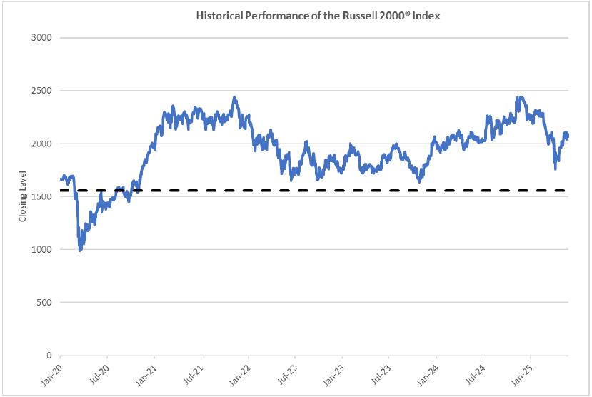 下图展示了罗素2000的表现®2020年1月2日至2025年5月29日指数。罗素2000指数的收盘水平®2025年5月29日指数为2,074.778。虚线代表假设的下行阈值1556.084,等于罗素2000指数收盘水平的75%®2025年5月29日指数(四舍五入至小数点后三位)。实际下行阈值将基于罗素2000的收盘水平®交易日期的指数。