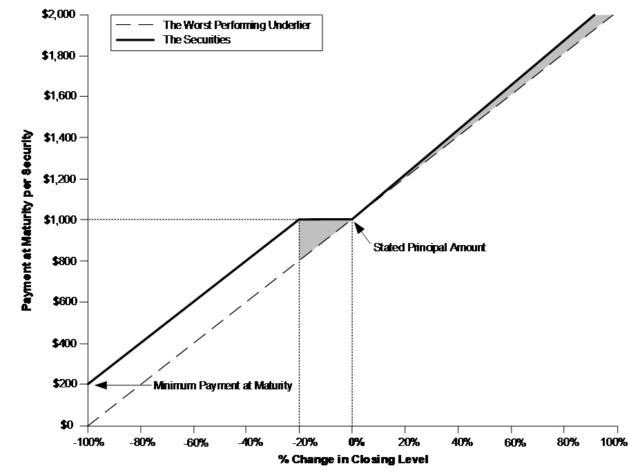 如果表现最差的债券贬值95%,那么投资者将损失75%的本金,到期时只能获得每份证券250美元的价值,即本金金额的25%。 |