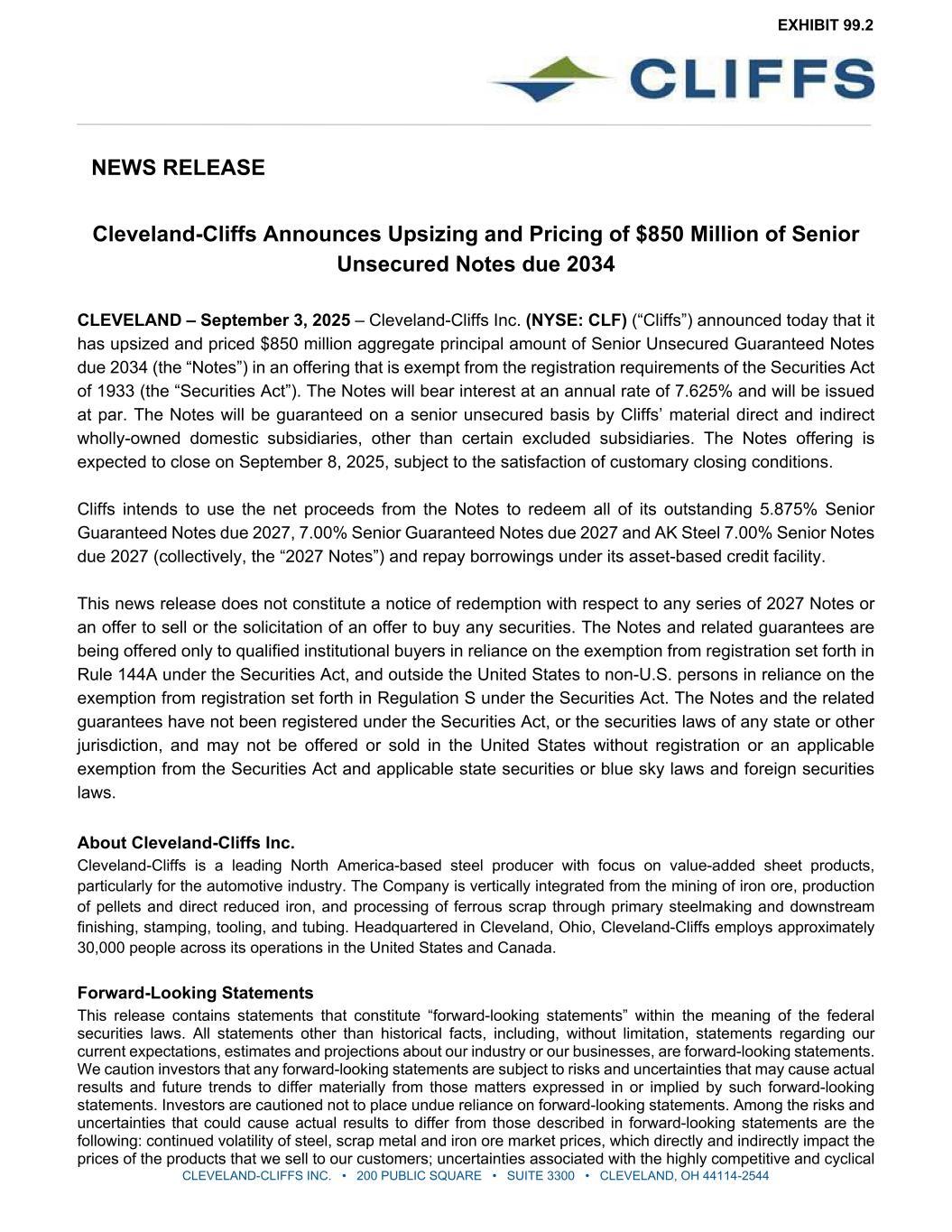 Cleveland-Cliffs INC. • 200 Public SQUARE • SUITE 3300 • Cleveland,OH 44114-2544 NEWS release 克利夫兰克里夫宣布对2034年到期的8.5亿美元高级无抵押票据进行规模调整和定价,Cleveland-Cliffs Inc. Cleveland-Cliffs Inc.(纽约证券交易所代码:CLF)(“Cliffs”)今天宣布,该公司在一次发行中对2034年到期的本金总额为8.5亿美元的高级无抵押担保票据(“票据”)进行了规模调整和定价,该发行免于1933年《证券法》(“证券法”)的注册要求。票据将按年利率7.625%计息,按面值发行。票据将由Cliffs的重大直接和间接全资国内子公司提供高级无抵押担保,但某些被排除在外的子公司除外。此次票据发行预计将于2025年9月8日结束,但须满足惯例成交条件。Cliffs拟将票据所得款项净额用于赎回其全部未偿还的2027年到期的5.875%优先担保票据、2027年到期的7.00%优先担保票据和AK Steel 2027年到期的7.00%优先票据(统称“2027票据”),并偿还其基于资产的信贷额度下的借款。本新闻稿不构成任何系列2027年票据的赎回通知或出售要约或购买任何证券的要约邀请。票据和相关担保仅依据《证券法》第144A条规定的登记豁免向合格机构买家提供,在美国境外则依据《证券法》第S条规定的登记豁免向非美国人提供。票据及相关担保未根据《证券法》或任何州或其他司法管辖区的证券法进行注册,未经注册或未获得《证券法》和适用的州证券法或蓝天法及外国证券法的适用豁免,不得在美国发售或出售。关于Cleveland-Cliffs Inc.克利夫兰克里夫是一家总部位于北美的领先钢铁生产商,专注于增值板材产品,尤其是汽车行业的板材产品。公司从铁矿石的开采、球团和直接还原铁的生产,到黑色废料的加工通过初级炼钢和下游精加工、冲压、工装、油管等环节纵向一体化。克利夫兰克里夫的总部位于俄亥俄州克利夫兰市,在美国和加拿大的业务部门拥有约30,000名员工。前瞻性陈述本新闻稿包含构成联邦证券法含义内“前瞻性陈述”的陈述。除历史事实之外的所有陈述,包括但不限于关于我们当前对我们行业或我们业务的预期、估计和预测的陈述,均为前瞻性陈述。我们提醒投资者,任何前瞻性陈述都存在风险和不确定性,可能导致实际结果和未来趋势与此类前瞻性陈述中明示或暗示的事项存在重大差异。告诫投资者不要过分依赖前瞻性陈述。可能导致实际结果与前瞻性陈述中描述的结果不同的风险和不确定性包括:钢铁、废金属和铁矿石市场价格的持续波动,直接和间接影响我们向客户销售的产品的价格;与高度竞争和周期性相关的不确定性展览99.2