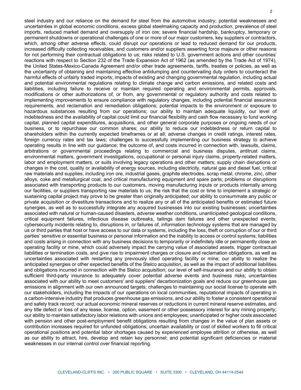 Cleveland-Cliffs INC. • 200 Public SQUARE • SUITE 3300 • Cleveland,OH 44114-2544 2钢铁行业和我们对汽车行业对钢铁需求的依赖;全球经济状况的潜在弱点和不确定性、全球炼钢产能和产量过剩、钢铁进口盛行、市场需求减少和铁矿石供应过剩;我们的一个或多个主要客户、主要供应商或承包商的严重财务困难、破产、临时或永久停工或运营挑战,除其他不利影响外,这可能会扰乱我们的运营或导致对我们产品的需求减少,增加应收账款回收的难度,以及客户和/或供应商以不可抗力或其他理由主张不履行对我们的合同义务;与美国政府行为和其他国家对1962年《贸易扩展法》(经1974年《贸易法》修订)第232条、美国-墨西哥-加拿大协定和/或其他贸易协定、关税、条约或政策相关的风险,以及获得和维持有效的反倾销和反补贴税令以抵消不公平贸易进口有害影响的不确定性;现有和不断变化的政府监管的影响,包括与气候变化和碳排放相关的实际和潜在环境法规,以及相关成本和责任,包括未能收到或维持任何政府或监管机构的所需运营和环境许可、批准、修改或其他授权,或来自任何政府或监管机构的其他授权,以及与实施改进相关的成本,以确保遵守监管变化,包括潜在的财务保证要求,以及回收和补救义务;我们的运营对环境产生的潜在影响或接触有害物质;我们保持充足流动性的能力,我们的负债水平和资本可用性可能会限制我们为营运资金、计划资本支出、收购和其他一般公司目的或我们业务的持续需求提供资金所必需的财务灵活性和现金流,或回购我们的普通股;我们在当前预期的时间范围内或根本没有减少债务或向股东返还资本的能力;信用评级、利率、外币汇率和税法的不利变化;成功实施我们的业务战略以实现符合我们指导的经营业绩所面临的挑战;结果,与商业和商业纠纷、反垄断索赔、环境事项、政府调查、职业或人身伤害索赔、财产相关事项、劳动和就业事项或涉及遗留经营和其他事项的诉讼有关的诉讼、索赔、仲裁或政府诉讼所产生的费用;供应链中断或能源成本、质量或可用性的变化,包括电力、天然气和柴油燃料、关键原材料和供应品,包括铁矿石、工业气体、石墨电极、废金属、铬、锌、其他合金、焦炭和冶金煤,以及关键的制造设备和备件;与向我们的客户运输产品、在我们的设施之间内部移动制造投入或产品或供应商向我们运输原材料相关的问题或中断;实施战略或持续性资本项目的成本或时间可能被证明比最初预期的更大的风险;我们完成任何公共或私人收购或剥离交易以及实现任何或所有预期收益或估计的未来协同效应的能力,以及成功地将任何收购的业务整合到我们现有的业务中;与自然或人为灾害、不利天气条件、意外地质条件、关键设备故障、传染病爆发、尾矿坝故障和其他意外事件相关的不确定性;与由我们或托管或有权访问我们的数据或系统的第三方管理的信息技术系统有关的网络安全事件、中断或故障,包括损失,我们或第三方的敏感或重要业务或个人信息被盗或腐败,以及无法访问或控制系统;与临时或无限期闲置或永久关闭运营设施或矿山的任何商业决策相关的负债和成本,这可能会对相关资产的账面价值产生不利影响,引发合同负债或终止成本,并产生减值费用或关闭和回收义务, 以及与重启任何先前闲置的运营设施或矿山相关的不确定性;我们实现收购Stelco的预期协同效应或其他预期收益的能力,以及与收购Stelco相关的额外责任和义务的影响;我们的自保水平以及我们获得足够的第三方保险以充分覆盖潜在不利事件和业务风险的能力;与我们满足客户和供应商的脱碳目标以及根据我们自己宣布的目标减少温室气体排放的能力相关的不确定性;维持我们与利益相关者合作运营的社会许可所面临的挑战,包括我们的运营对当地社区的影响,在产生温室气体排放的碳密集型行业运营的声誉影响,以及我们培养一致的运营和安全记录的能力;我们的实际经济矿产储量或当前矿产储量估计的减少,以及任何租赁、许可证、选择权的任何所有权缺陷或损失,任何采矿财产的地役权或其他占有式权益;我们与工会和雇员保持令人满意的劳动关系的能力;因计划资产价值变化或无资金债务所需的缴款增加而导致的与养老金和其他离职后福利义务相关的意外或更高成本;填补关键运营职位的技术工人的可用性或成本不确定,以及由经验丰富的员工减员或其他原因造成的潜在劳动力短缺,以及我们吸引、雇用、发展和留住关键人员的能力;以及我们对财务报告的内部控制可能存在的重大缺陷或重大缺陷。