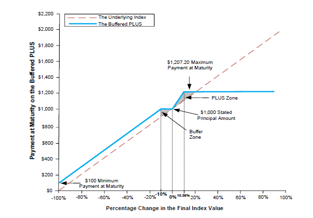 如果最终索引值大于初始索引值: 1,000美元+杠杆上行支付 在任何情况下,到期付款都不会超过到期最高付款。 若最终指标值小于或等于初始指标值但较初始指标值下降幅度小于或等于10%的缓冲量: $1,000 若最终指标值小于初始指标值,且较初始指标值下降幅度大于缓冲量10%: (1000美元×指数绩效系数)+ 100美元 在这种情况下,到期付款将低于规定的本金1000美元。然而,在任何情况下,Buffered PLUS在到期时都不会为每个Buffered PLUS支付低于100美元的费用。 |