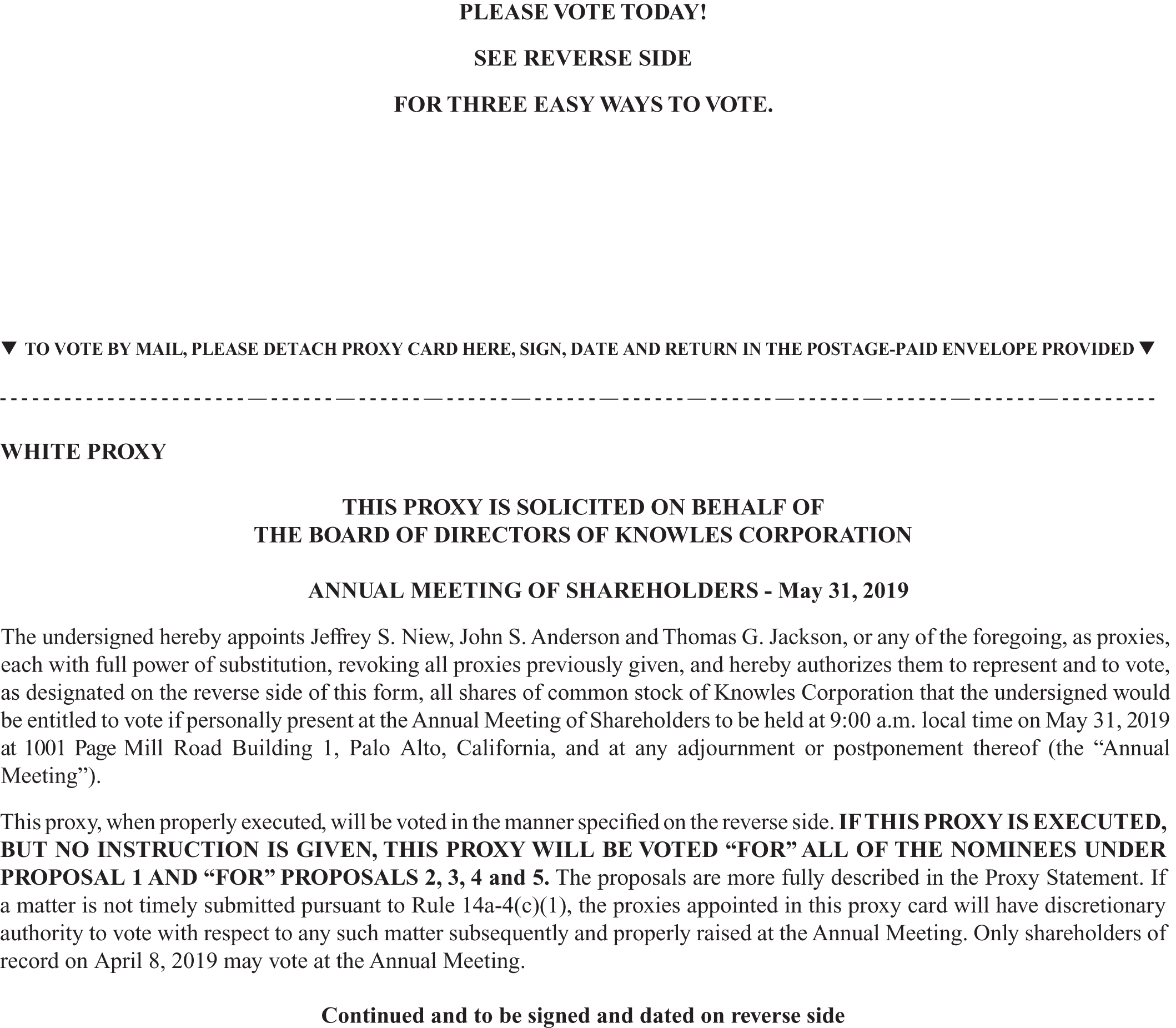 兹通知,特拉华州一家公司Knowles Corporation的2019年年度股东大会(包括其任何休会或延期,即“2019年年度会议” )将于5月31日举行, “公司” 、 “Knowles” 、 “我们” 、 “我们”和“我们”的任何合并子公司,2019年当地时间上午9:00,加利福尼亚州帕洛阿尔托,帕洛米尔路1号1001页94304,用于以下目的: