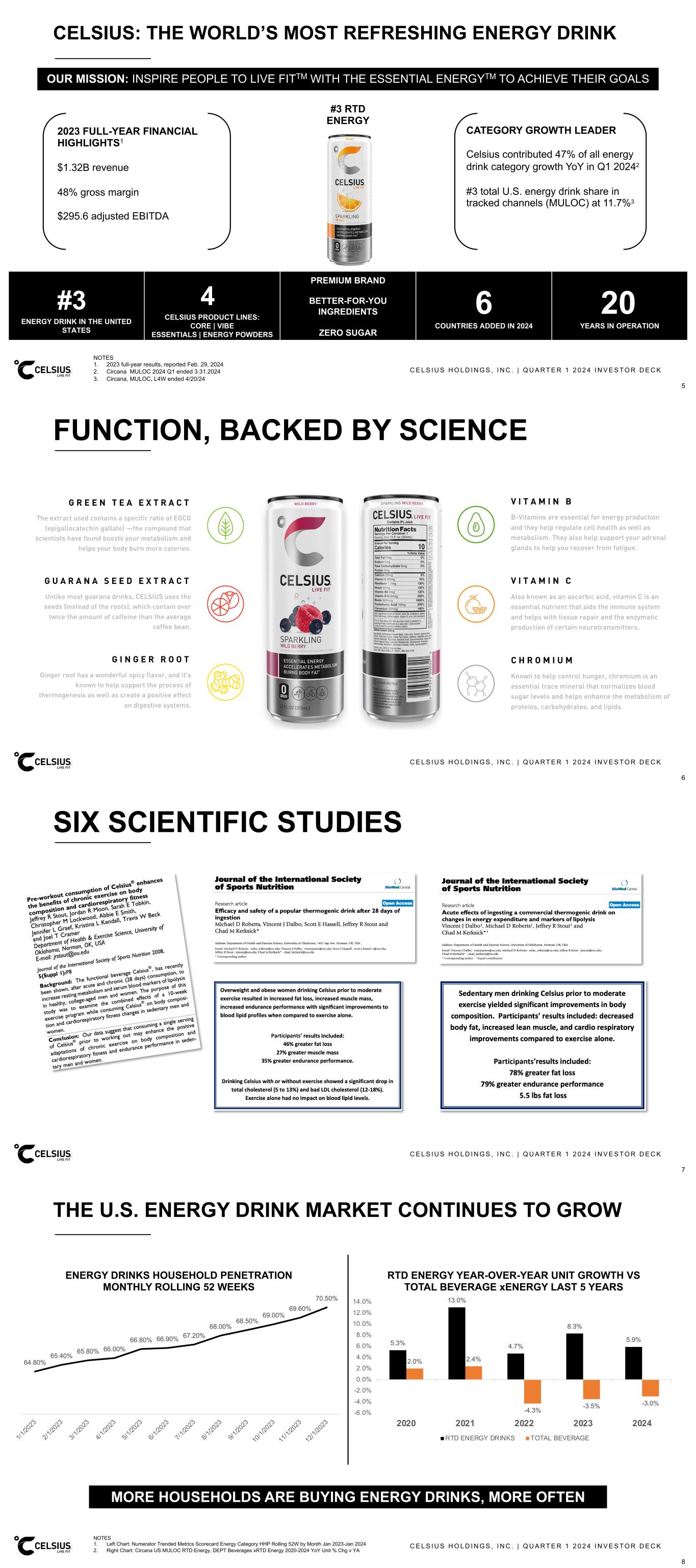 C E L S I US H O L D I N G S,I N C. | Q U A R T E R 12024 I N V E S T O R D E C K CELSIUS:世界上最令人耳目一新的能量饮料我们的使命:激励人们与基本的能量TM一起生活以实现他们的目标# 3美国的能量饮料4 CELSIUS产品线:核心| VIBE Essentials | Energy Powers PREMIUM品牌BETTER-FOR-You成分零糖6国2023年全年业绩,2024年2月29日报告2。Circana MULOC2024 Q1结束3.3 1.20243。Circana、MULOC、L4W结束4/20/24 # 3 RTD ENERGY 2023全年财务亮点1 $ 1.32B收入48%毛利率295.6美元调整后EBITDA类别增长领导者Celsius贡献了所有能量饮料类别同比增长的47% 20242 # 3美国能量饮料在已跟踪渠道(MULOC)的总份额为11.7% 35 C E L S I US H O L D I N G S,I N C. | Q U A R T E R 12024 I N V E S T O R D E C K函数,以科学为后盾6 C E L S I US H O L D I N G S,I N C. | Q U A R T E R 12024 I N V E S T O R D E C K六项科学研究7 C E L S I US H O L D I N G S,i n c. | q u a r t t t t t t t t t t t t t t t t t t t t t t t t t t t t t t t t t t t t t t t t t t t t t t t t t t t t t t t t t t t t t t t t t t t t t t t t t t t t t t t t t t t t t t t t t t t t t t t t t t t t t t t t t t t t t t t t t t t t t t t t t t t t t t t t t t t t t t t t t t t t t t t t t t t t t t t t t t t t t t t t t t t t t t t t t t t t t t t t t t t t t t t t t t t5.9% 2.0% 2.4%-4.3 %-3.5 %-3.0 %-6.0 %-4.0 %-2.0 % 0.0% 2.0% 4.0% 6.0% 8.0% 10.0% 12.0% 14.0% 20202021202220232024 RTD能源同比单位增长VS总饮料能源最近5年RTD能源饮料总饮料更多的家庭在购买能源饮料,更经常注意1。左图:分子趋势指标记分卡能源类别HHP按月滚动52W 2023年1月至2024年1月2。右图:Circana US MULOC RTD Energy、DEPT Beverages XRTD Energy 2020-2024 YoY单位% CHG v YA8