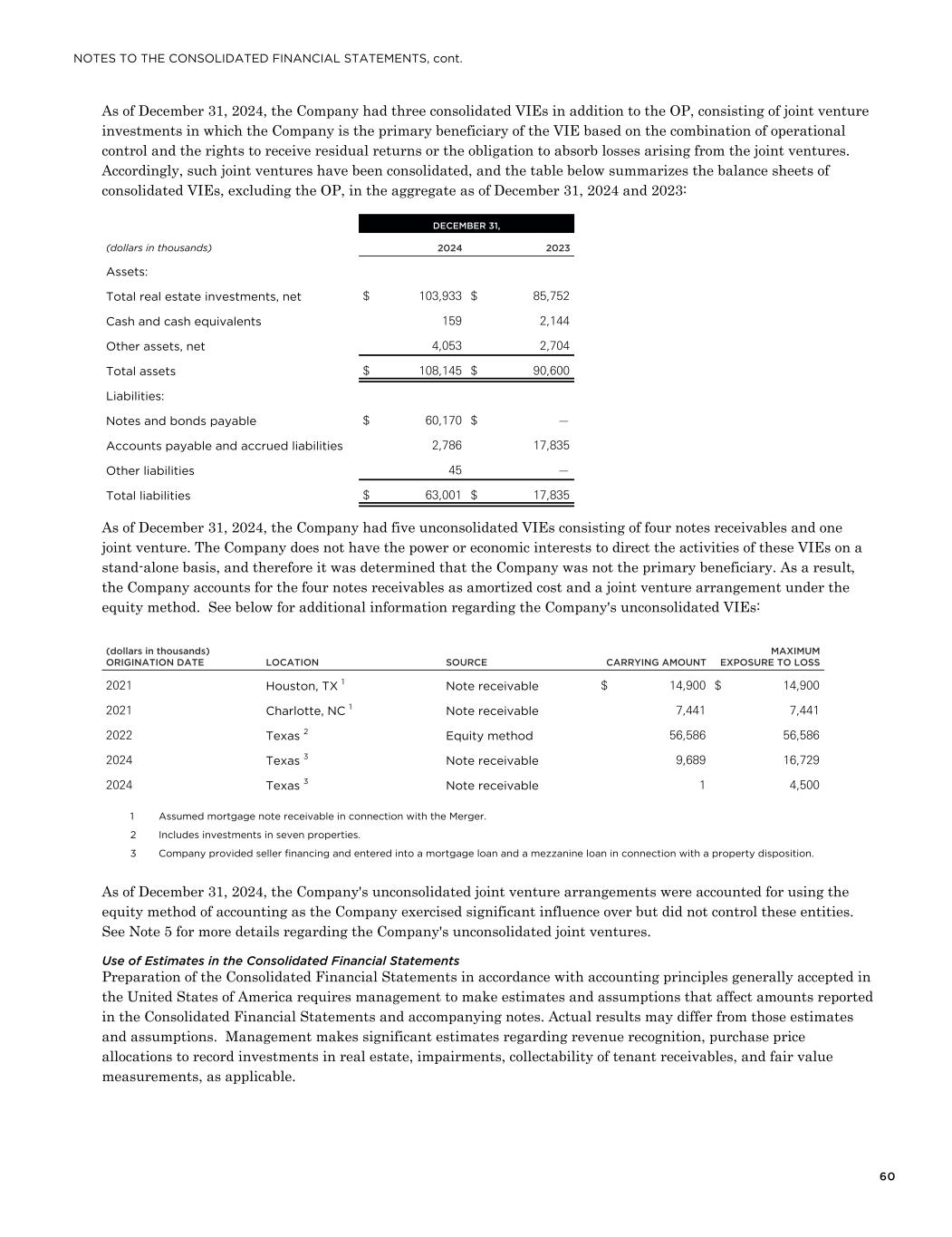截至2024年12月31日,公司除OP外还有三个合并VIE,包括公司作为VIE主要受益人的合营企业投资,其基础是运营控制权和收取剩余回报的权利或吸收合营企业产生的损失的义务相结合。因此,这些合资企业已被合并,下表汇总了截至2024年12月31日和2023年12月31日的合并VIE资产负债表,不包括OP,合计:12月31日,(千美元)20242023资产:房地产投资总额,净额103,933美元85,752美元现金和现金等价物1592,144其他资产,净额4,0532,704总资产108,145美元90,600美元负债:应付票据和债券60,170美元——应付账款和应计负债2,78617,835其他负债45 ——截至2024年12月31日负债总额63,001美元17,835美元,该公司有五个未合并VIE,包括四个应收票据和一个合资企业。公司没有权力或经济利益单独指导这些VIE的活动,因此确定公司不是主要受益人。因此,公司将四笔应收票据作为摊余成本和权益法下的合营安排进行会计处理。有关公司未合并VIE的更多信息,请参见下文:(单位:千美元)起始日Location Source carrying amount maximum exposure to loss 2021 Houston,TX 1 note receivable $ 14,900 $ 14,9002021 Charlotte,NC 1 note receivable 7,4417,4412022 Texas 2 equity method 56,58656,5862024 Texas 3 note receivable 9,68916,7292024 Texas 3 note receivable 14,5001 assumed mortgage note receivable with the merger。2包括对七处房产的投资。3公司向卖方提供融资,并就物业处置订立抵押贷款及夹层贷款。截至2024年12月31日,由于公司对这些实体施加了重大影响但并未控制这些实体,因此公司未合并的合营安排采用权益会计法进行了会计处理。有关公司未合并合营企业的更多详情,请参阅附注5。在综合财务报表中使用估计根据美利坚合众国普遍接受的会计原则编制综合财务报表要求管理层作出影响综合财务报表及附注中报告的金额的估计和假设。实际结果可能与这些估计和假设不同。管理层就收入确认、用于记录房地产投资的购买价格分配、减值、租户应收款项的可收回性以及公允价值计量(如适用)作出重大估计。合并财务报表附注,续。60