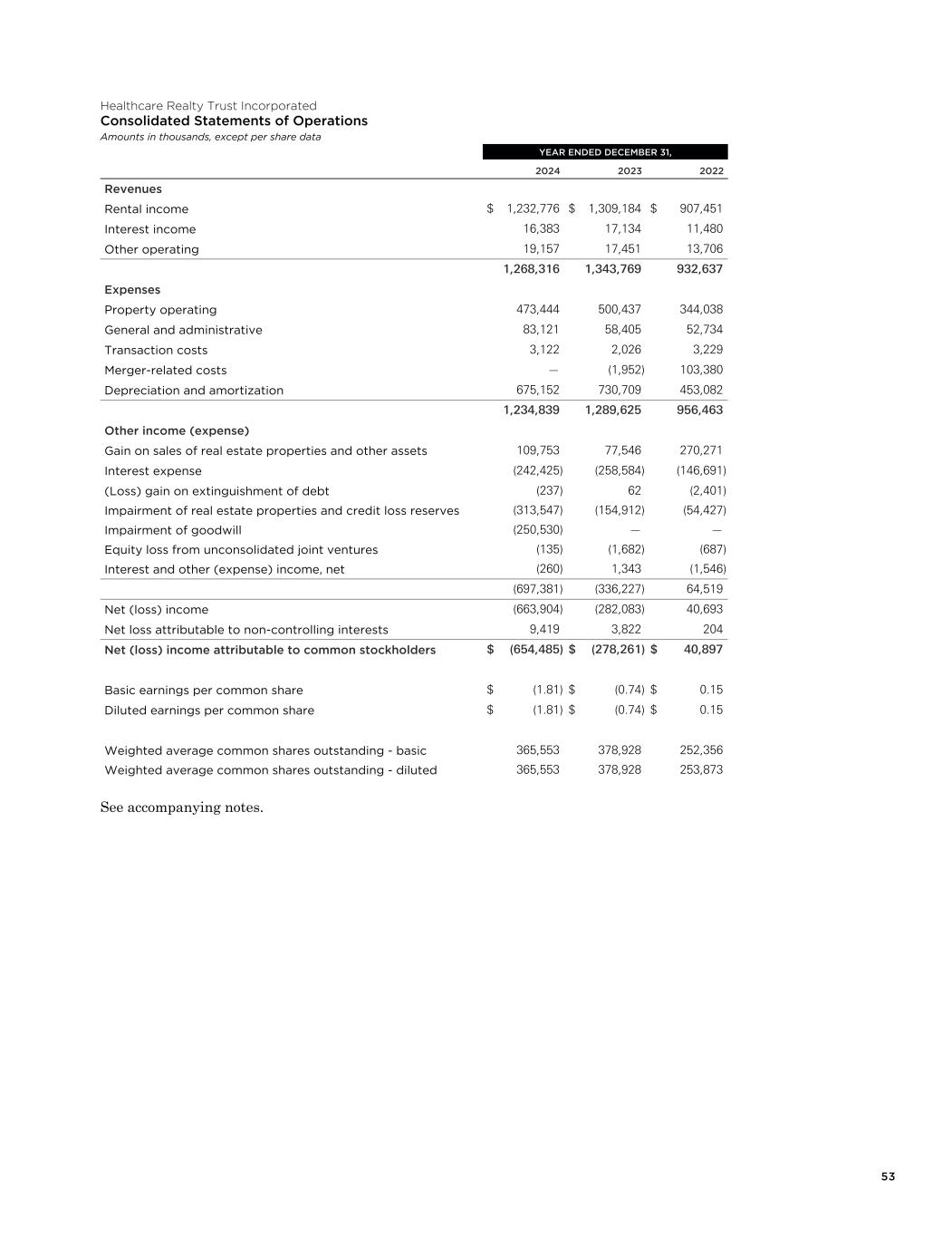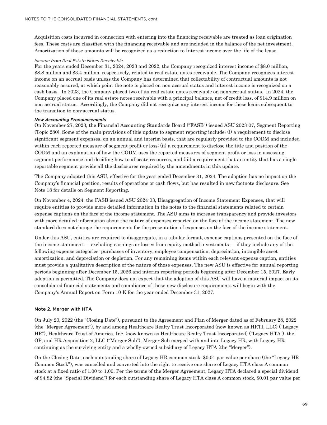 就订立融资应收款项而产生的收购成本被视为贷款发起费用。这些成本与应收融资分类,计入净投资余额。这些金额的摊销将在租赁期限内确认为利息收入的减少。应收房地产票据收入截至2024年12月31日、2023年和2022年12月31日止年度,公司确认与应收房地产票据相关的利息收入分别为8.0百万美元、8.8百万美元和3.4百万美元。公司按权责发生制确认利息收入,除非公司确定合同金额的可收回性没有得到合理保证,此时票据被置于非权责发生制状态,利息收入按收付实现制确认。2023年,公司将两笔房地产应收票据置于非应计状态。2024年,该公司将其一笔房地产应收票据置于非应计状态,其本金余额(扣除信用损失)为1490万美元。因此,在过渡到非应计状态后,公司没有确认这些贷款的任何利息收入。新会计公告2023年11月27日,财务会计准则委员会(“FASB”)发布ASU 2023-07,分部报告(主题280)。本次更新对分部报告的一些主要规定包括:(i)要求按年度和中期披露定期提供给主要经营决策者并包含在每一报告的分部损益计量中的重大分部费用;(ii)要求披露主要经营决策者的标题和立场,并解释主要经营决策者如何在评估分部业绩和决定如何分配资源时使用报告的分部损益计量,(iii)要求拥有单一可报告分部的实体在本次更新中提供修订要求的所有披露。公司采纳此ASU,于截至2024年12月31日止年度生效。该采用对公司的财务状况、经营业绩或现金流量没有影响,但导致了新的脚注披露。有关分部报告的详细信息,请参见附注18。2024年11月4日,FASB发布了ASU 2024-03,损益表费用分类,这将要求实体在与损益表正面的某些费用标题相关的财务报表附注中提供更详细的信息。ASU旨在提高透明度,并向投资者提供有关损益表表面报告的费用性质的更详细信息。新准则不改变费用在损益表正面列报的要求。根据这一ASU,如果实体包括以下任何费用类别:购买库存、员工薪酬、折旧、无形资产摊销以及折旧或损耗,则实体必须以表格形式对损益表正面显示的费用标题进行分类——不包括权益法投资的收益或损失。对于每个相关费用标题中的任何剩余项目,实体必须提供这些费用性质的定性描述。新的ASU在2026年12月15日之后开始的年度报告期间和2027年12月15日之后开始的中期报告期间生效。允许提前收养。公司预计,采用该ASU不会对其合并财务报表产生重大影响,这些新披露要求的遵守将从公司截至2027年12月31日止年度的10-K表格年度报告开始。注2。与HTA合并于2022年7月20日(“交割日”),根据日期为2022年2月28日的合并协议和计划(“合并协议”),由Healthcare Realty Trust Incorporated(现称为HRTI,LLC)(“Legacy HR”)、Healthcare Trust of America,Inc.(现称为Healthcare Realty Trust Incorporated)(“Legacy HTA”)、OP以及HR Acquisition 2,LLC(“Merger Sub”)合并为Legacy HR,Legacy HR继续作为存续实体和Legacy HTA的全资子公司(“合并”)。在交割日,每股面值0.01美元的Legacy HR普通股(“Legacy HR普通股”)的流通股被注销,并转换为以1.00比1.00的固定比例获得一股Legacy HTA A类普通股的权利。根据合并协议的条款,Legacy HTA宣布向Legacy HTA A类普通股的每股流通股派发4.82美元的特别股息(“特别股息”),每股合并财务报表票据面值0.01美元,续。69