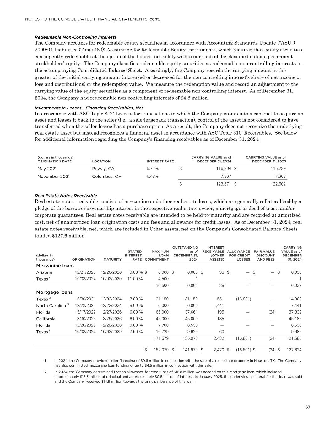 可赎回非控股权益公司根据会计准则更新(“ASU”)2009-04会计准则对可赎回权益证券进行会计处理负债(主题480):对可赎回权益工具进行会计处理,这要求持有人可选择的或有可赎回的权益证券,而不仅仅是在我们的控制范围内,被分类到永久股东权益之外。公司在随附的综合资产负债表中将可赎回股本证券分类为可赎回非控制性权益。据此,公司按初始账面值(非控股权益在净收益或亏损及分配中所占份额的增加或减少)或赎回价值两者中较高者记录账面值。我们衡量赎回价值,并将权益证券的账面价值调整记录为可赎回非控股权益的组成部分。截至2024年12月31日,公司可赎回的非控股权益为480万美元。租赁投资-应收融资款,净额按照ASC主题842:租赁,对于公司订立收购资产合同并将其租回给卖方的交易(即售后回租交易),当卖方-承租人拥有购买选择权时,该资产的控制权不被视为已转移。因此,公司不确认标的房地产资产,而是按照ASC主题310:应收账款确认一项金融资产。有关公司截至2024年12月31日应收融资款的更多信息,请参见下文。(单位:千美元)起始日期位置利率截至2024年12月31日的账面价值截至2023年12月31日的账面价值2021年5月Poway,加利福尼亚州 5.71% $ 116,304 $ 115,2392021年11月Columbus,OH 6.48% 7,3677,363 $ 123,671 $ 122,602房地产应收票据房地产应收票据包括夹层和其他房地产贷款,通常以借款人在各自房地产所有者的所有权权益质押、抵押或信托契据和/或公司担保作抵押。房地产应收票据拟持有至到期,按摊余成本入账,扣除未摊销的贷款发起成本和费用以及信用损失准备金。截至2024年12月31日,公司合并资产负债表中计入“其他资产”的房地产应收票据净额总计1.276亿美元。(单位:千美元)来源到期说明利率截至2024年12月31日未偿还的贷款承诺应收利息(其他资产)信用损失准备公允价值贴现和截至12月31日的费用账面价值,2024夹层贷款Arizona 12/21/202312/20/20269.00% $ 6,000 $ 6,000 $ 6,000 $ 38 $ — $ — $ 6,038 Texas 110/03/202410/02/202911.00% 4,5001 ———— 110,5006,00138 —— 6,039抵押贷款Texas 26/30/202112/02/20247.00% 31,15031,150551(16,801)— 14,900 North Carolina 312/22/202112/22/20248.00% 6,0006,0001,441 —— 7,441 Florida 5/17/20222/27/20266.00% 65,00037,661195 —(24)37,832 California 3/30/20233/29/20266.00% 45,10/03/202410/02/20297.50% 16,7299,62960 —— 9,689171,579135,9782,432(16,801)(24)121,585 $ 182,079 $ 141,979 $ 2,470 $(16,801)$(24)$ 127,6241在2024年,公司就出售德克萨斯州休斯顿的一处房地产向卖方提供了960万美元的融资。该公司还承诺为此次出售提供高达450万美元的夹层贷款资金。22024年,公司确定这笔抵押贷款需要1680万美元的信贷损失准备金,其中包括约1630万美元的本金和约50万美元的利息。2025年1月,这笔贷款的基础抵押品被出售,公司收到了这笔贷款本金余额1490万美元。合并财务报表附注,续。67