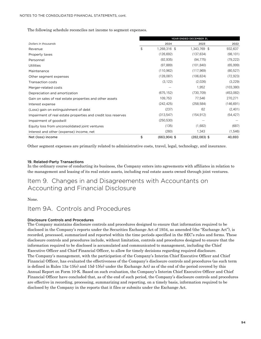 以下时间表将净收入与分部费用进行核对。截至12月31日,千美元202420232022收入$ 1,268,316 $ 1,343,769 $ 932,637财产税(126,692)(137,634)(98,101)人事(92,935)(94,775)(79,222)公用事业(97,889)(101,840)(65,999)维护(110,962)(117,969)(80,527)其他分部费用(128,087)(106,624)(72,923)交易成本(3,122)(2,026)(3,229)与合并相关的成本— 1,952(103,380)折旧和摊销(675,152)(730,709)(453,082)出售不动产和其他资产收益109,75377,546270,和信用损失准备金(313,547)(154,912)(54,427)商誉减值(250,530)——未合并合营企业的股权损失(135)(1,682)(687)利息和其他(费用)收入净额(260)1,343(1,546)净(亏损)收入$(663,904)$(282,083)$ 40,693其他分部费用主要与行政费用、差旅、法律、技术和保险有关。19.关联交易公司在开展业务的日常过程中,与关联公司就其房地产资产,包括通过合营企业拥有的房地产资产的管理和租赁订立协议。项目9。会计和财务披露方面的变化和与会计师的分歧无。项目9a。控制和程序披露控制和程序公司维持披露控制和程序,旨在确保根据经修订的1934年《证券交易法》(“交易法”)要求在公司报告中披露的信息在SEC规则和表格规定的时间段内得到记录、处理、汇总和报告。这些披露控制和程序包括但不限于旨在确保积累所需披露的信息并将其传达给管理层(包括首席执行官和首席财务官)的控制和程序,以便能够就所需披露作出及时决定。公司管理层在公司临时首席执行官和首席财务官的参与下,评估了截至本10-K表格年度报告所涵盖期间结束时公司披露控制和程序(该术语在《交易法》下规则13a-15(e)和15d-15(e)中定义)的有效性。基于该评估,公司临时首席执行官和首席财务官得出结论:截至该期间结束时,公司的披露控制和程序在记录、处理、总结和报告方面是有效的,及时提供公司根据《交易法》提交或提交的报告中要求披露的信息。合并财务报表附注,续。94