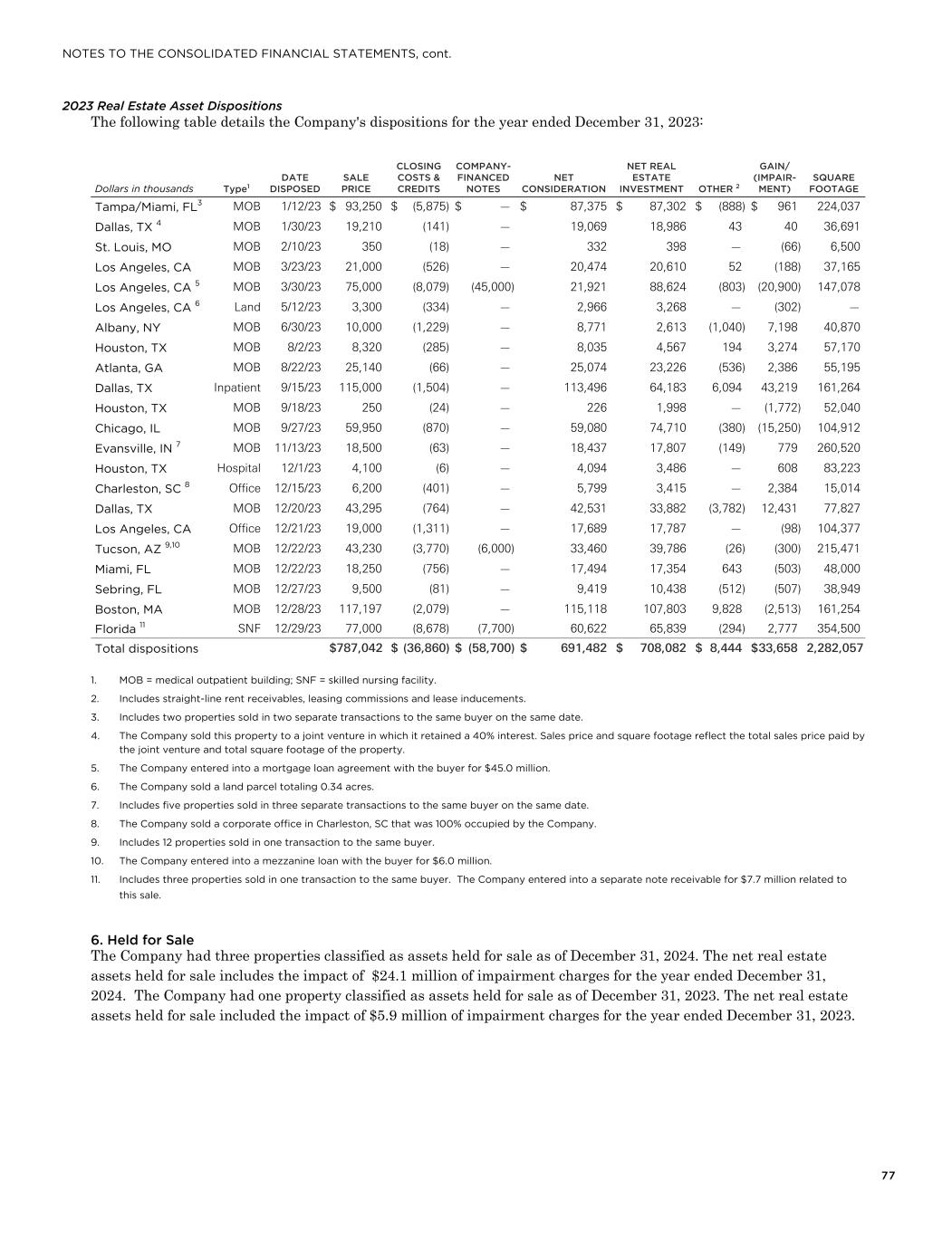 2023房地产资产处置下表详细列出了公司截至2023年12月31日止年度的处置情况:千美元Type1 DATE Disposed Sale Price Closing Costs & Credits Company融资票据净对价净房地产投资其他2收益/(IMPAIR-MENT)SQUARE Footage Tampa/Miami,FL3 MOB 1/12/23 $ 93,250 $(5,875)$ — $ 87,375 $ 87,302 $(888)$ 961224,037 Dallas,TX 4 MOB 1/30/2319,210(141)— 19,06918,986434036,691 St. Louis加利福尼亚州 MOB 3/23/2321,000(526)— 20,47420,61052(188)37,165洛杉矶,加利福尼亚州 5 MOB 3/30/2375,000(8,079)(45,000)21,92188,624(803)(20,900)147,078洛杉矶,TERM6 Land 5/12/233,300(334)— 2,9663,268 —(302)— Albany,NY MOB 6/30/2310,000(1,229)— 8,7712,613(1,040)7,19840,870 Houston,TX MOB 8/2/238,320(285)— 8,0354,5671943,27457,170 Atlanta,GA MOB 8/22/2325,140(66)— 25德克萨斯州MOB 9/18/23250(24)— 2261,998 —(1,772)52,040伊利诺伊州芝加哥MOB 9/27/2359,950(870)— 59,08074,710(380)(15,250)104,912 Evansville,IN 7 MOB 11/13/2318,500(63)— 18,43717,807(149)779260,520 Houston,TX Hospital 12/1/234,100(6)— 4,0943,486 — 60883,223 Charleston,SC 8 Office 12/15/236,200(401)— 5,7993,415 — 2,38415,014 Dallas,TX MOB 12/20/2343,295(764)— 42,53133,882(AZ 9,10 MOB 12/22/2343,230(3,770)(6,000)33,46039,786(26)(300)215,471 Miami,FL MOB 12/22/2318,250(756)— 17,49417,354643(503)48,000 Sebring,FL MOB 12/27/239,500(81)— 9,41910,438(512)(507)38,949 Boston,MA MOB 12/28/23117,197(2,079)— 115,118107,8039,828(2,513)161,254 Florida 11 SNF 12/29/2377,000(8,678)(7,700)60,62265,839(294)2MOB =医疗门诊楼;SNF =熟练护理设施。2.包括直线应收租金、租赁佣金和租赁诱导。3.包括在同一日期分两笔单独交易出售给同一买方的两处房产。4.该公司将此物业出售给一家合资企业,其保留了40%的权益。销售价格及建筑面积反映合营公司支付的总销售价格及物业的总建筑面积。5.公司与买方订立抵押贷款协议,金额为4,500万美元。6.公司出让一宗地块共0.34亩。7.包括在同一日期分三笔单独交易出售给同一买家的五处房产。8.该公司出售了位于南卡罗来纳州查尔斯顿的公司办公室,该办公室由该公司100%占有。9.包括在一笔交易中出售给同一买家的12处房产。10.该公司与买方签订了一笔600万美元的夹层贷款。11.包括在一笔交易中出售给同一买家的三处房产。该公司与此次出售有关,以770万美元的价格单独订立了一笔应收票据。6.持有待售截至2024年12月31日,公司有三处物业分类为持有待售资产。持有待售的房地产净资产包括截至2024年12月31日止年度的2410万美元减值费用的影响。截至2023年12月31日,公司有1处物业分类为持有待售资产。持有待售的房地产净资产包括截至2023年12月31日止年度的590万美元减值费用的影响。合并财务报表附注,续。77